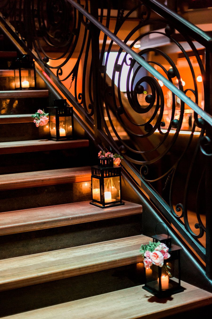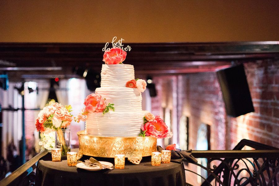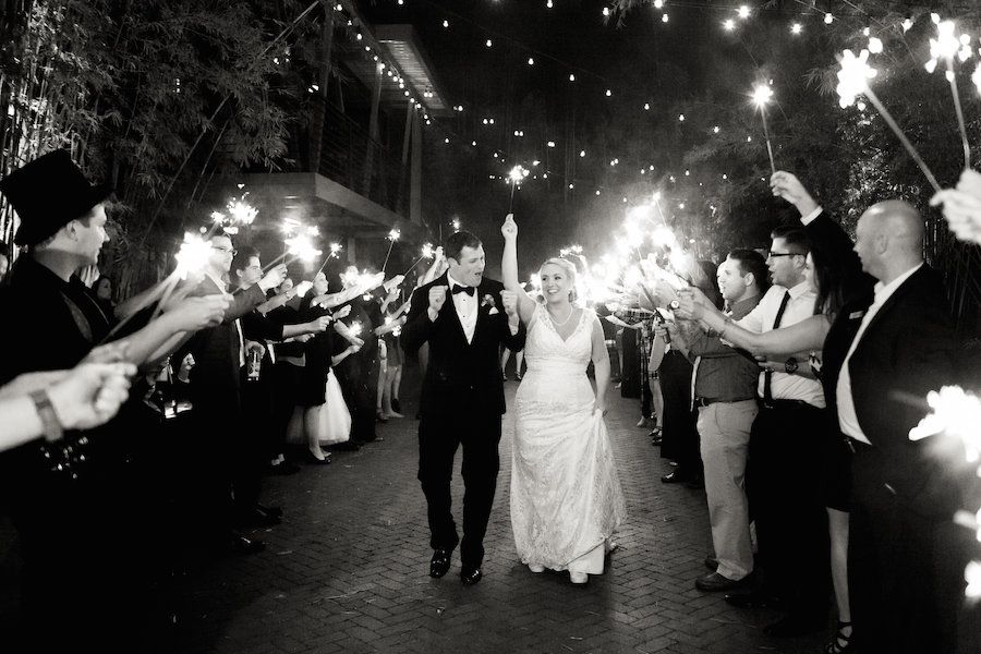 Black and White Wedding Guest Book and Sign in Table Ideas Unique St Petersburg Wedding Reception Space with Brick Walls and Modern Decor at NOVA 535 Wedding and Event Space St. Pete Wedding Reception Table Decor with Candlelight and Ivory and Coral Bouquet of Flowers in Gold Centerpieces with Script Gold Table Numbers St. Pete Wedding Reception Table Decor with Wooden Twigs in Black Vase Centerpieces with Candles |Black and Chrome Wedding Reception Chairs| St. Pete Wedding and Event Space NOVA 535 St. Pete Wedding Reception Sweetheart Table Decor with Gold Mr & Mrs Blocks and Coral and Ivory Flowers | Wedding Venues with Brick Walls in St. Pete Wedding and Event Venue NOVA 535 Three Tiered, Round White Wedding Cake with Coral Flower Accents Wedding Staircase Decor with Coral Peony Accent Flowers with Black Lanterns Outdoor, St Pete Wedding Ceremony, Bride and Groom First Kiss Portrait| St. Pete Wedding and Event Space NOVA 535 Bride and Groom St. Pete Sparkler Wedding Exit | St. Petersburg Wedding and Event Space NOVA 535