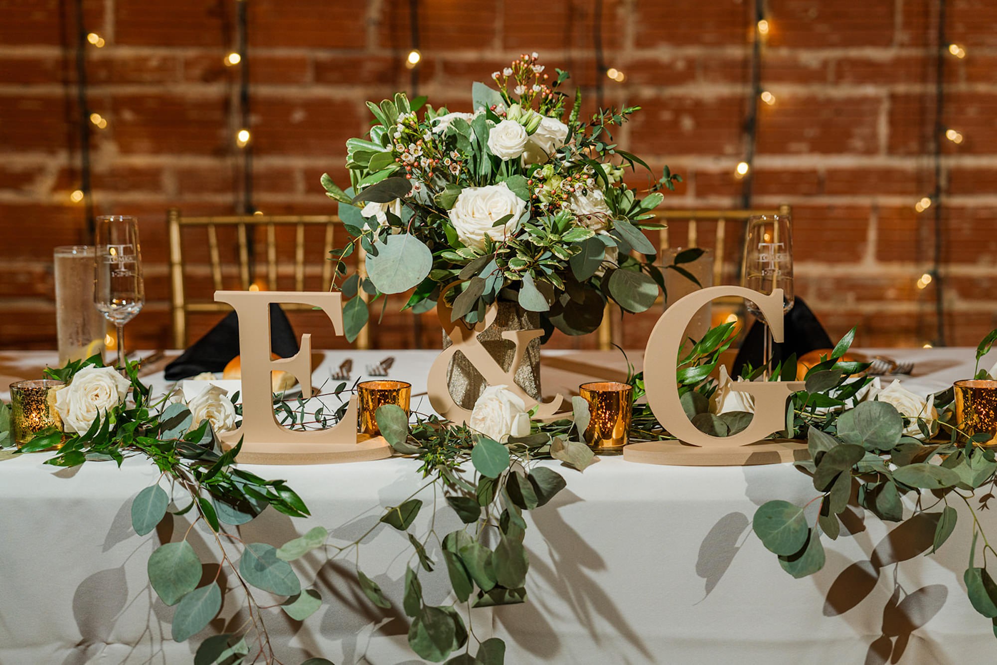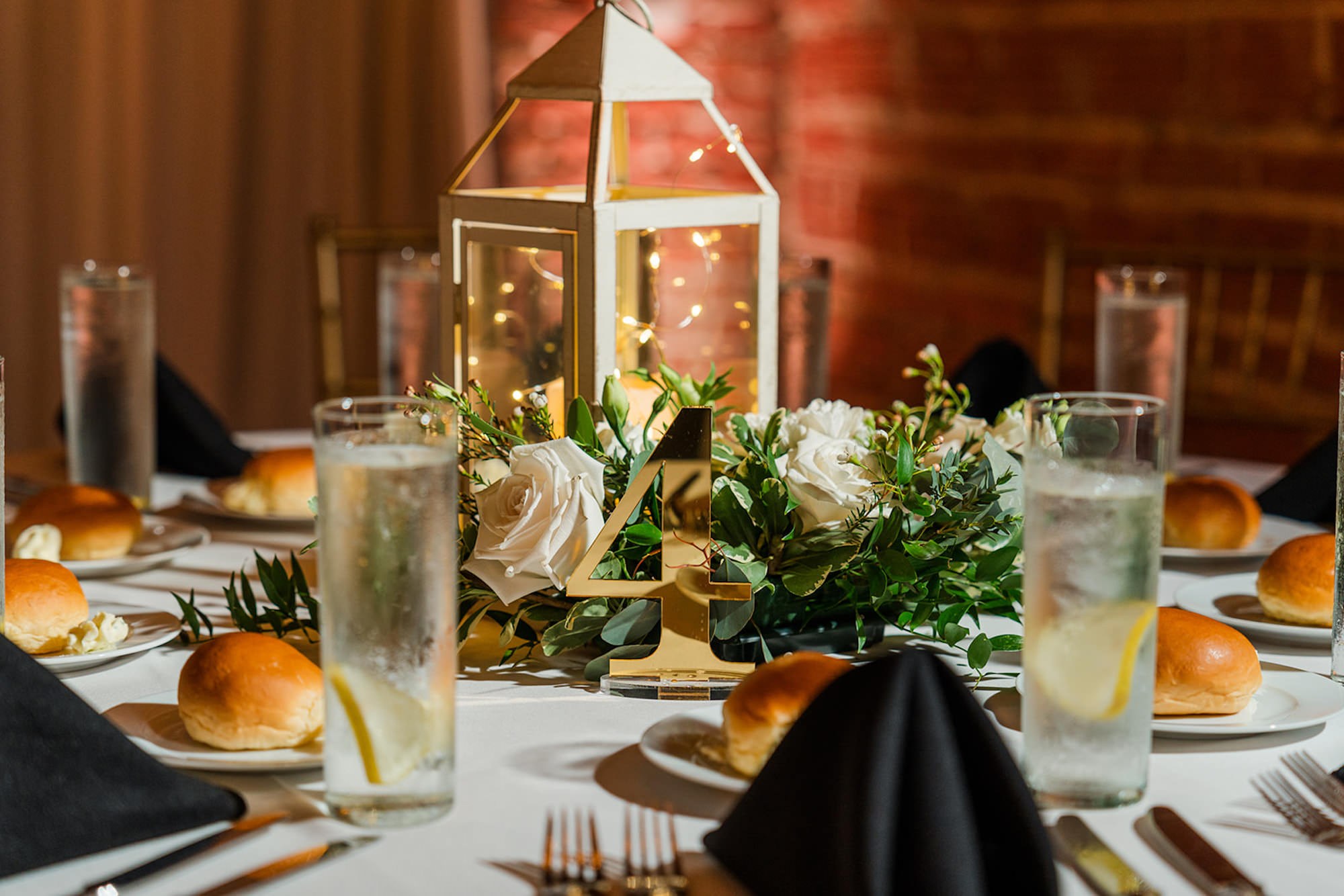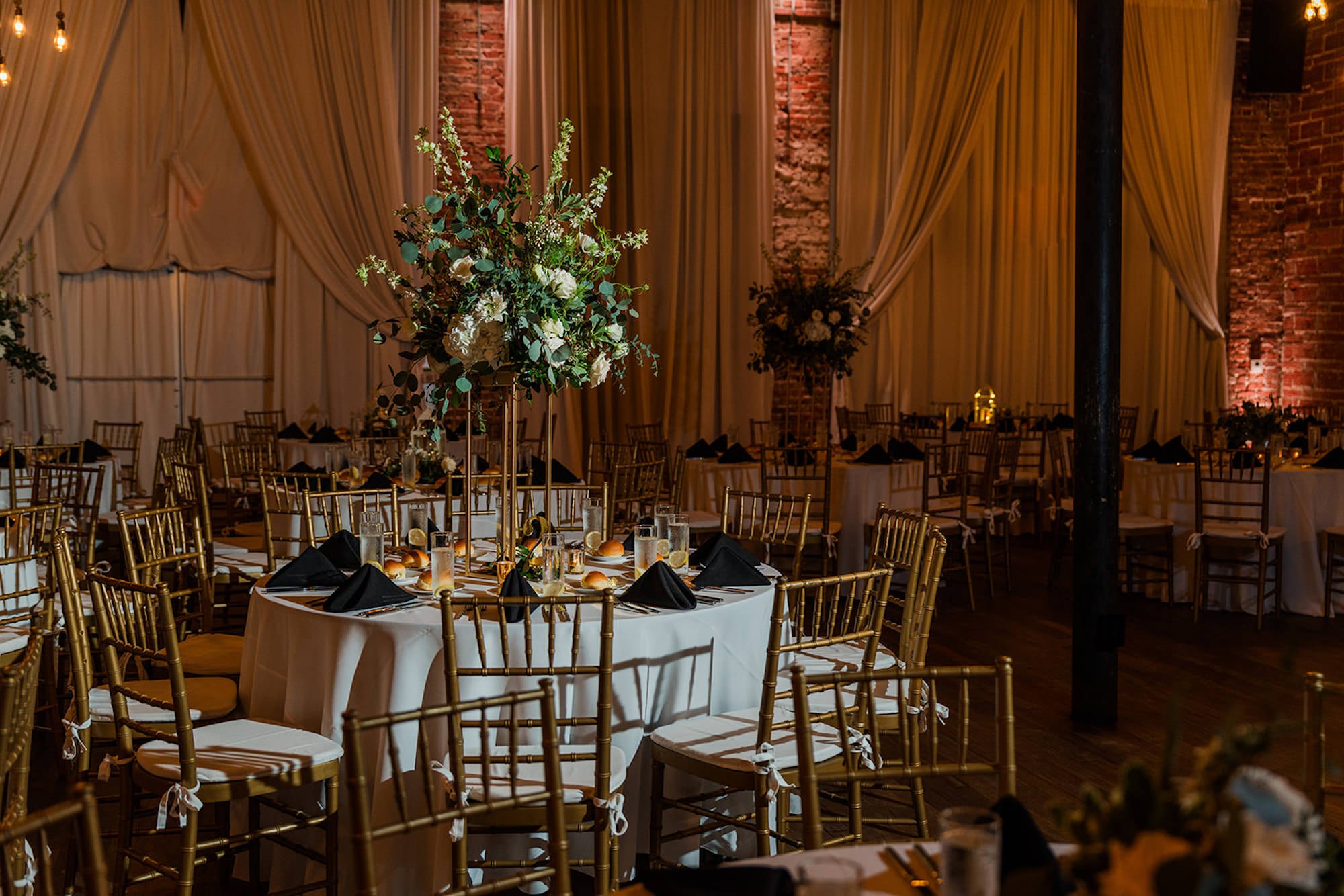 The reception began downstairs, set against the venue’s original exposed brick walls with exposed beamed ceilings. The interior lighting created a romantic ambiance, while a mix of high and low centerpieces and gold decor created an elegant atmosphere.