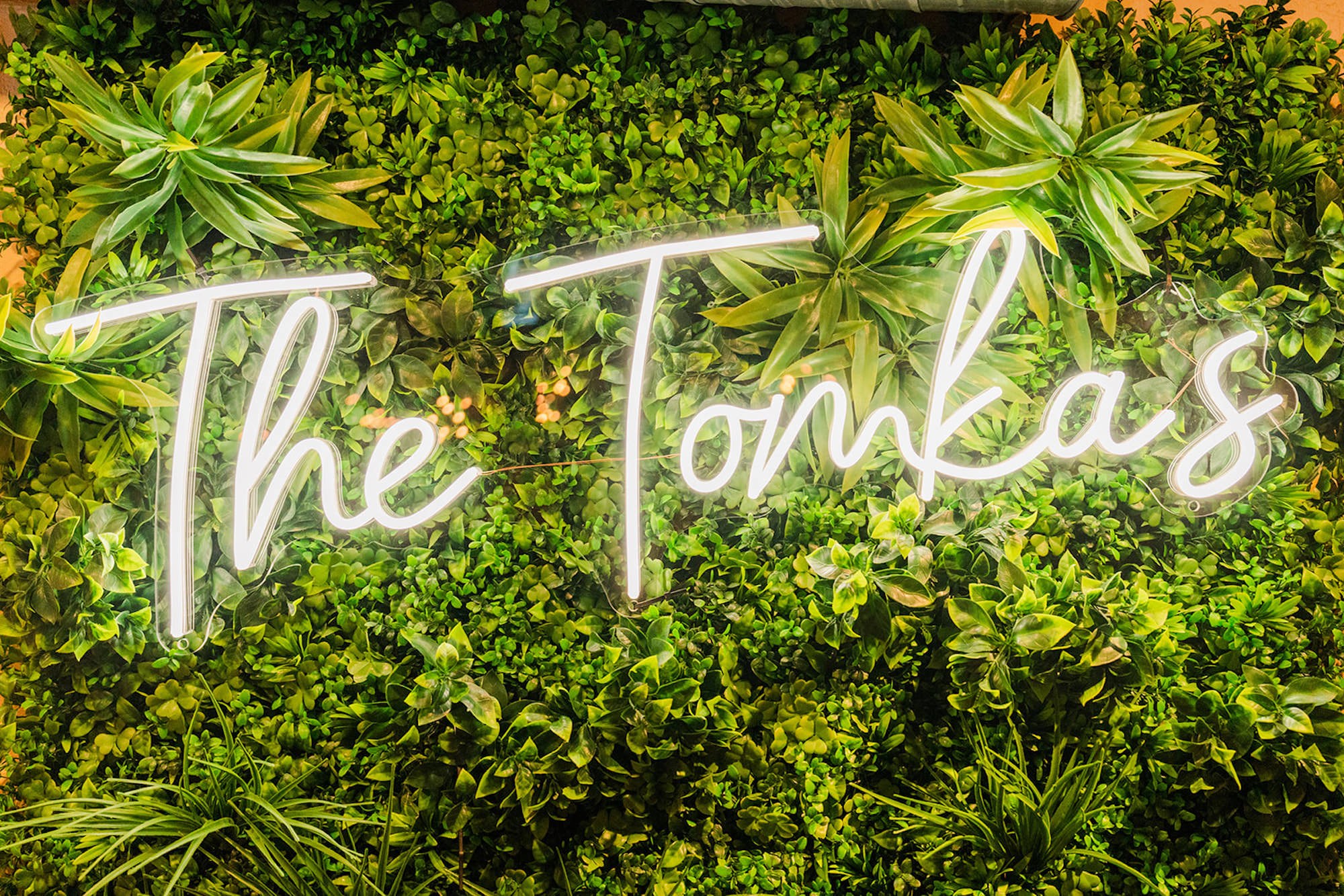 As guests proceeded upstairs for cocktail hour, Emily and Greg’s custom neon sign was placed against a lush greenery wall, which made for the perfect photo opportunity. A signature cocktail inspired by the couple’s cat, Gru, was served as family and friends awaited the newlywed’s grand entrance.