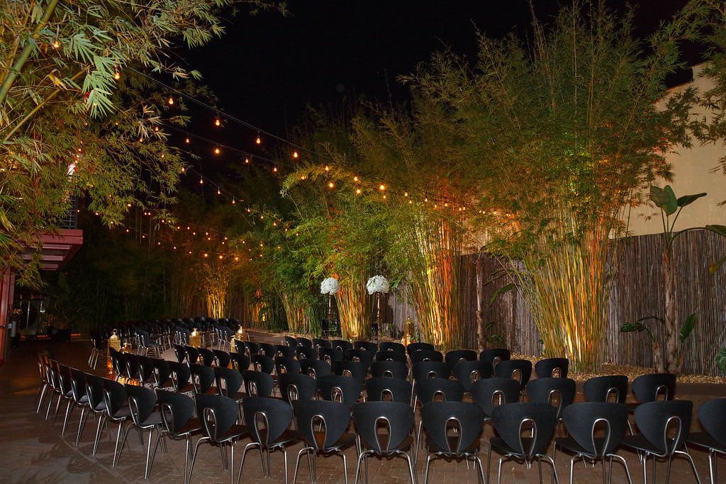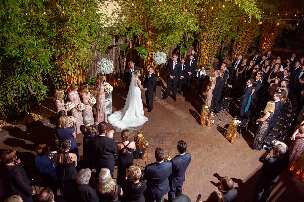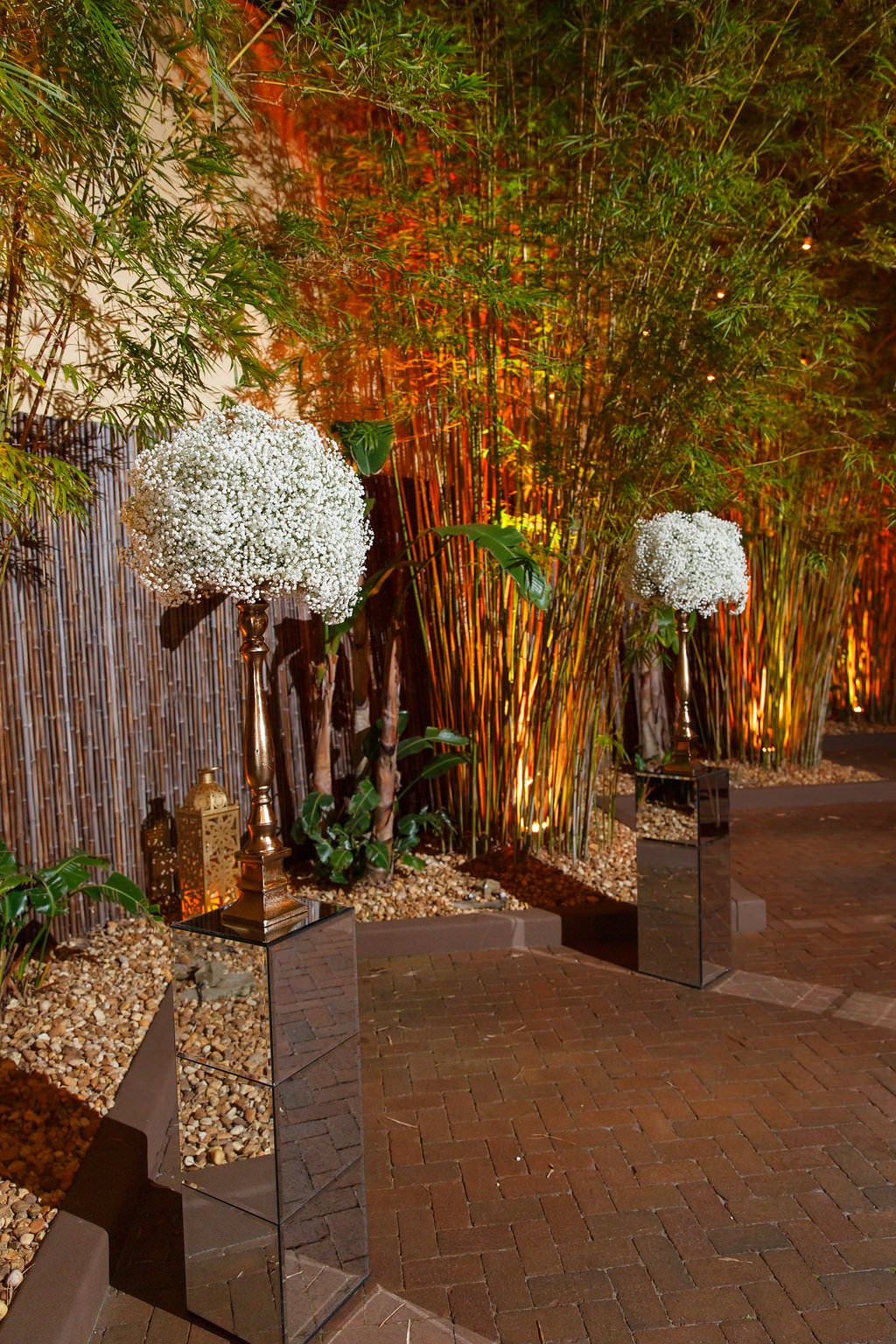 Wedding Ceremony Decor with Mirrors and Tall White and Gold Floral Arrangement | Outdoor Tampa Bay Wedding Ceremony in Bamboo Garden Downtown St. Pete Wedding Venue NOVA 535 Wedding Ceremony Decor | Gold Candlelit Lantern Aisle Decor Tampa Bay Outdoor Wedding Ceremony at Downtown St. Pete Wedding Venue NOVA 535 Outdoor Nighttime Wedding Portrait of Bride and Groom at Downtown St. Pete Wedding Venue NOVA 535 Bride and Groom Wedding Portrait with New Year's Eve Champagne Tower at Downtown St. Pete Wedding Venue NOVA 535