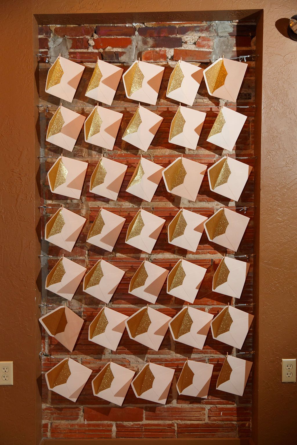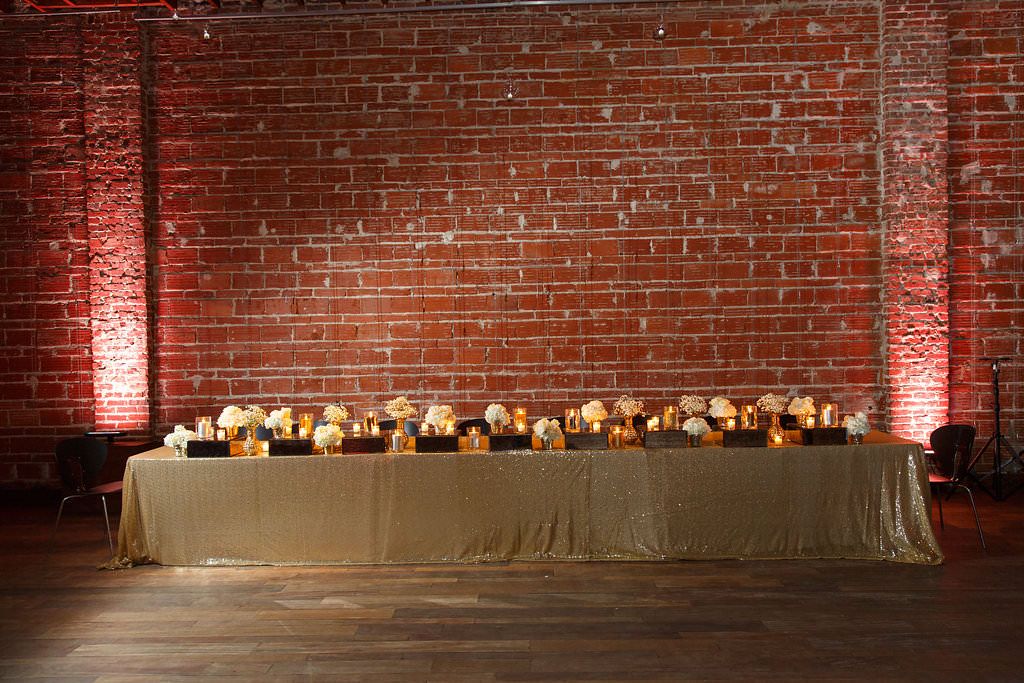 Wedding Escort Cards in Gold Sparkle/Glitter Envelopes | Wedding Reception Seating Ideas | New Year's Eve St. Pete Wedding Long Feasting Table with Gold Sparkle/Sequin Linens with Candlelight and Elegant White Hydrangea and Babysbreath Centerpieces | Wedding Reception Decor | Exposed Brick Walls at St. Pete Wedding Venue NOVA 535