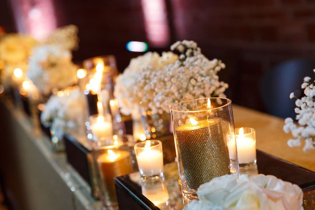 Gold Glitter Candles and Votives with White Hydrangea and Babysbreath Centerpieces on Mirrored Stands | New Year's Eve Wedding Reception Decor | New Year's Eve St. Pete Wedding Candles and Votives with White and Ivory Rose and Hydrangea Wedding Centerpieces on Mirrored Stands | New Year's Eve Wedding Reception Decor | New Year's Eve St. Pete Wedding Bride and Groom First Dance on Wedding Day Portrait at St. Pete Wedding Venue NOVA 535 New Year's Eve St. Pete Wedding