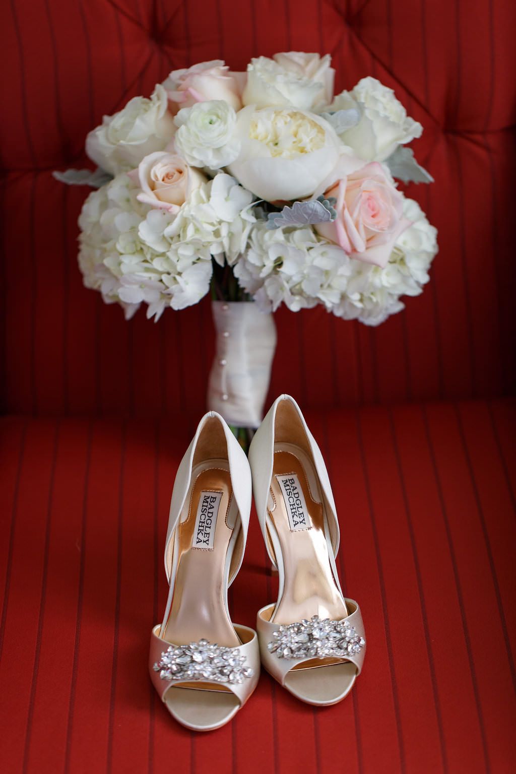 Bridal Champagne Open Toed Badgley Mischka Wedding Shoes with Rhinestone Brooch and Ivory and Blush Pink Hydrangea and Rose Bridal Wedding Bouquet White Brides by Demetrios Sweetheart Lace Wedding Dress with Rhinestone Belt and Lace Train Bride and Groom Outdoor St. Pete Wedding First Look Portrait | ivory and Blush Wedding Bouquet with Hydrangeas | White Lace Wedding Dress with Train