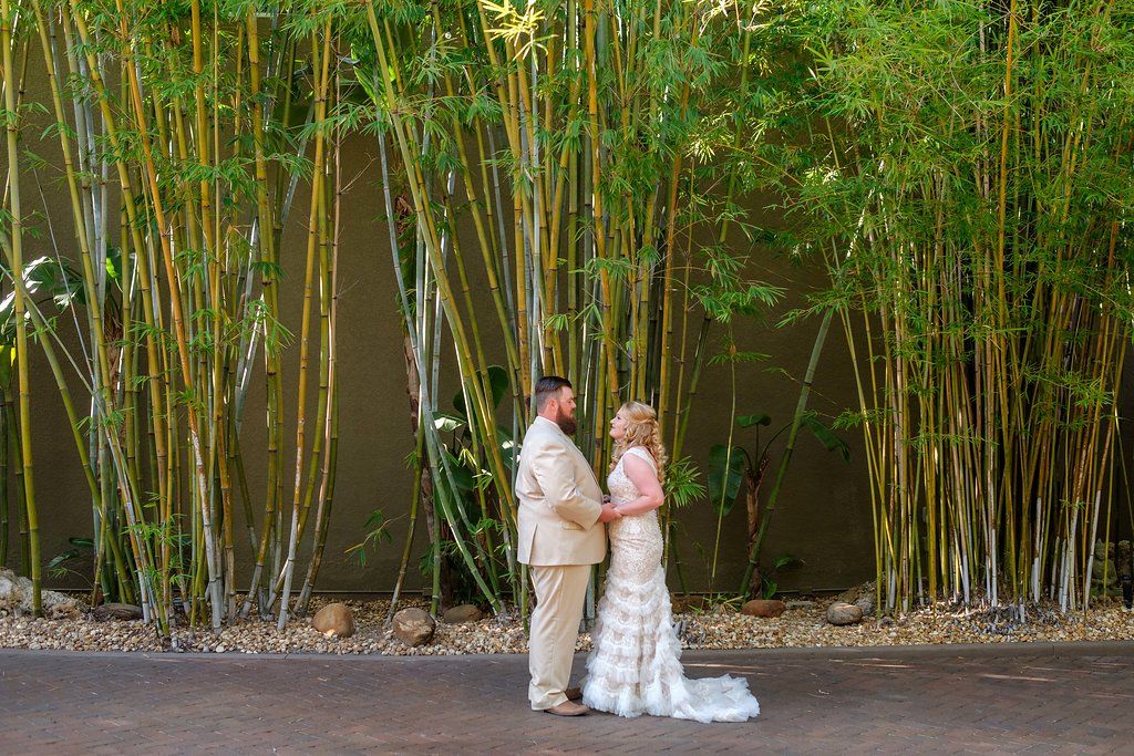 “So many different meanings to green and greenery, being green and green thumbs. Well I’ve always loved trees, the color green is that of life, my favorite, and I love when others share my love of green. We operate as a green eco-friendly company, paperless, and working hard to eliminate all single use plastic; recently eliminating plastic straws completely. All our single use “plastic’ is now compostable, eco friendly. Green is life, showcased by our massive bamboos, standing tall and proud in our private brick courtyard. Green also means Go. Go forth newlyweds, to love each other and enjoy your new lives together. Congrats to Kyle and Mariah, such a lovely couple!!