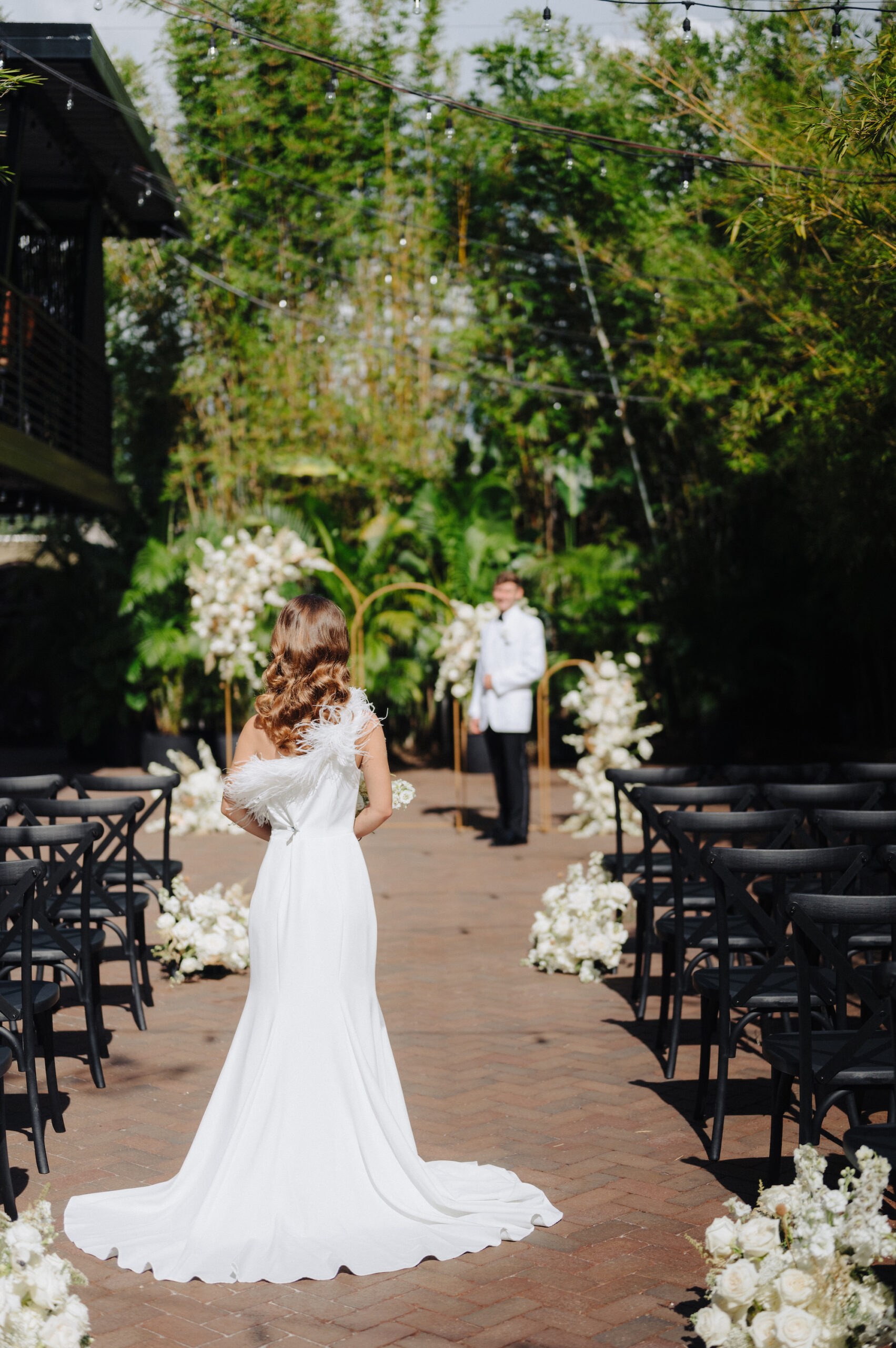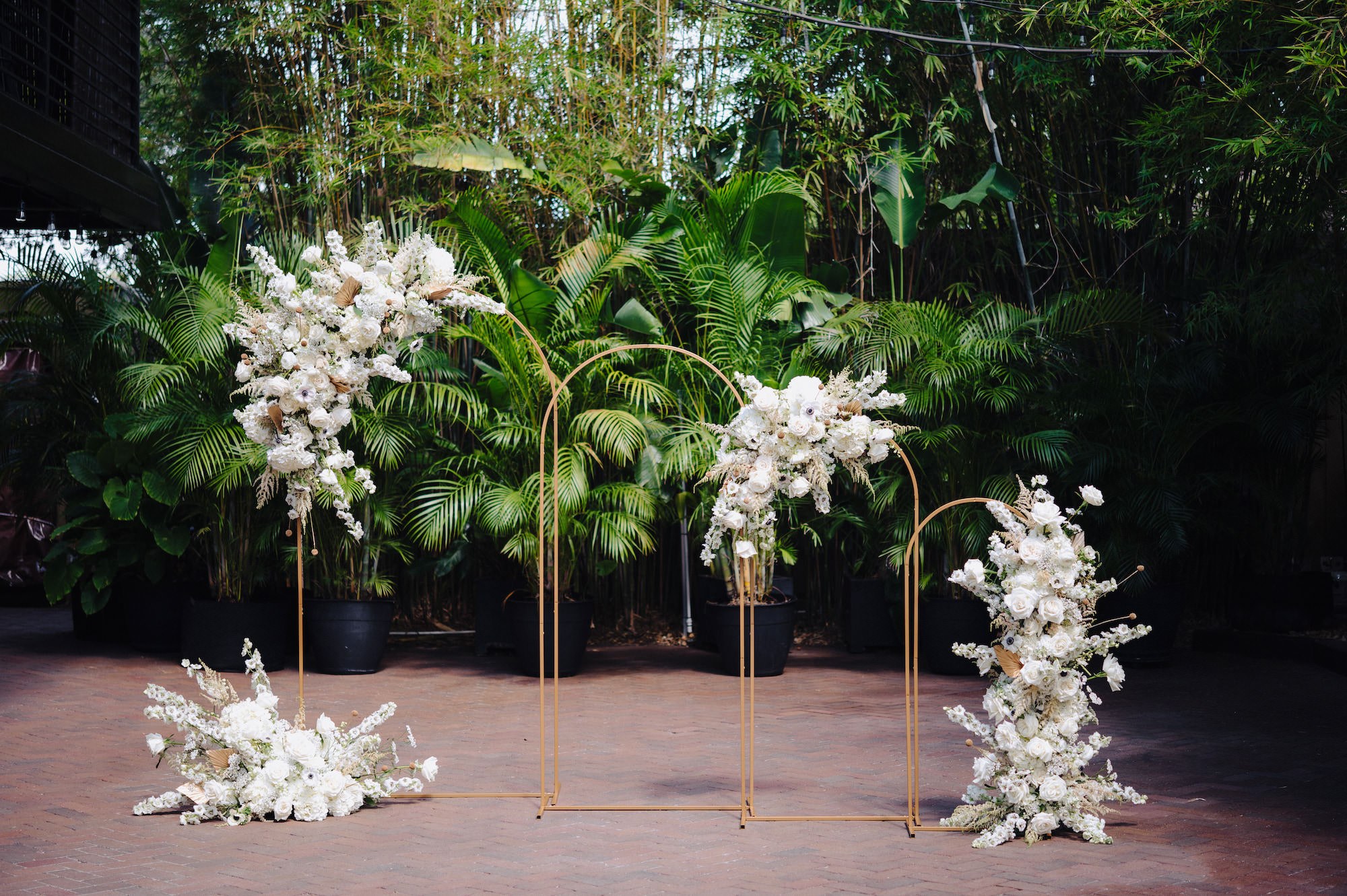 Capturing the allure of a bygone era, NOVA 535’s golden ceremony arches were adorned with white and gold florals, which also extended gracefully down the aisle. The venue’s black cross-back chairs and enchanting string lighting transformed the bamboo courtyard into an idyllic setting for a outdoor Florida wedding.