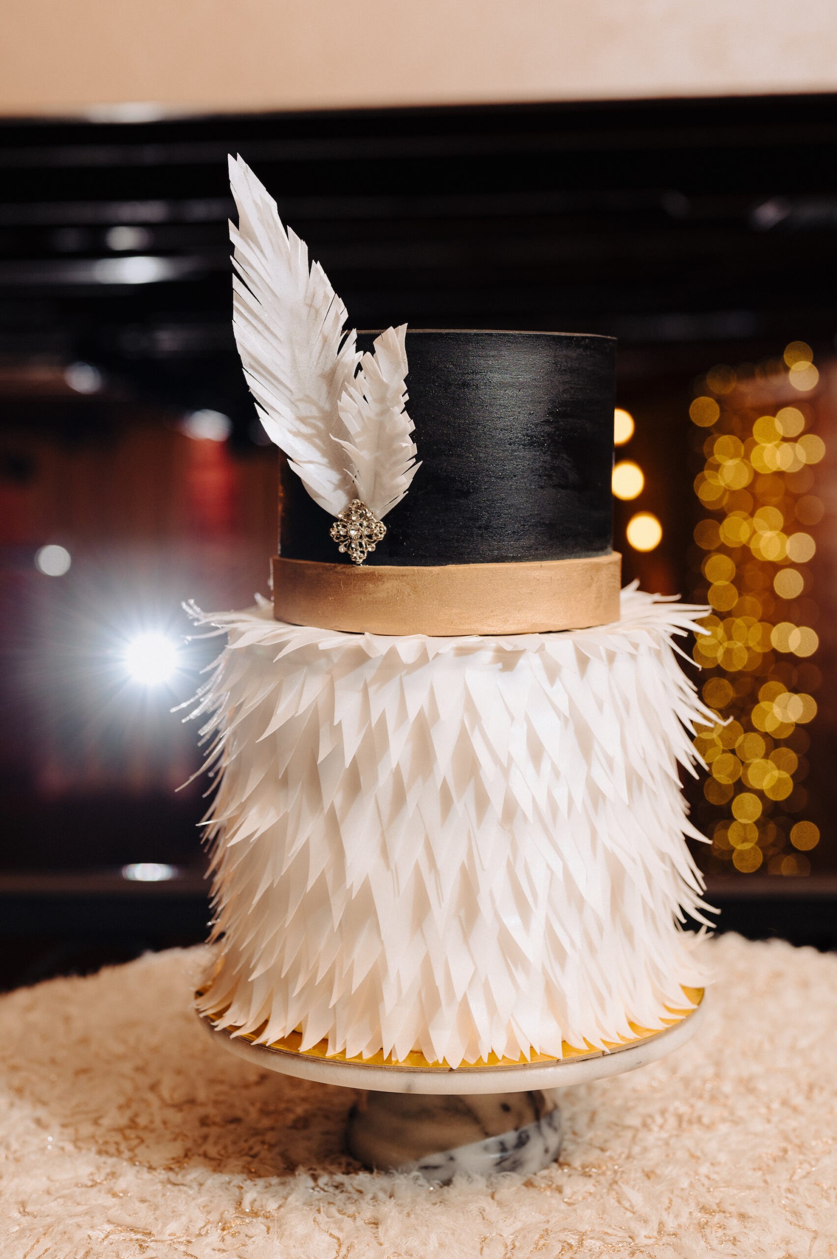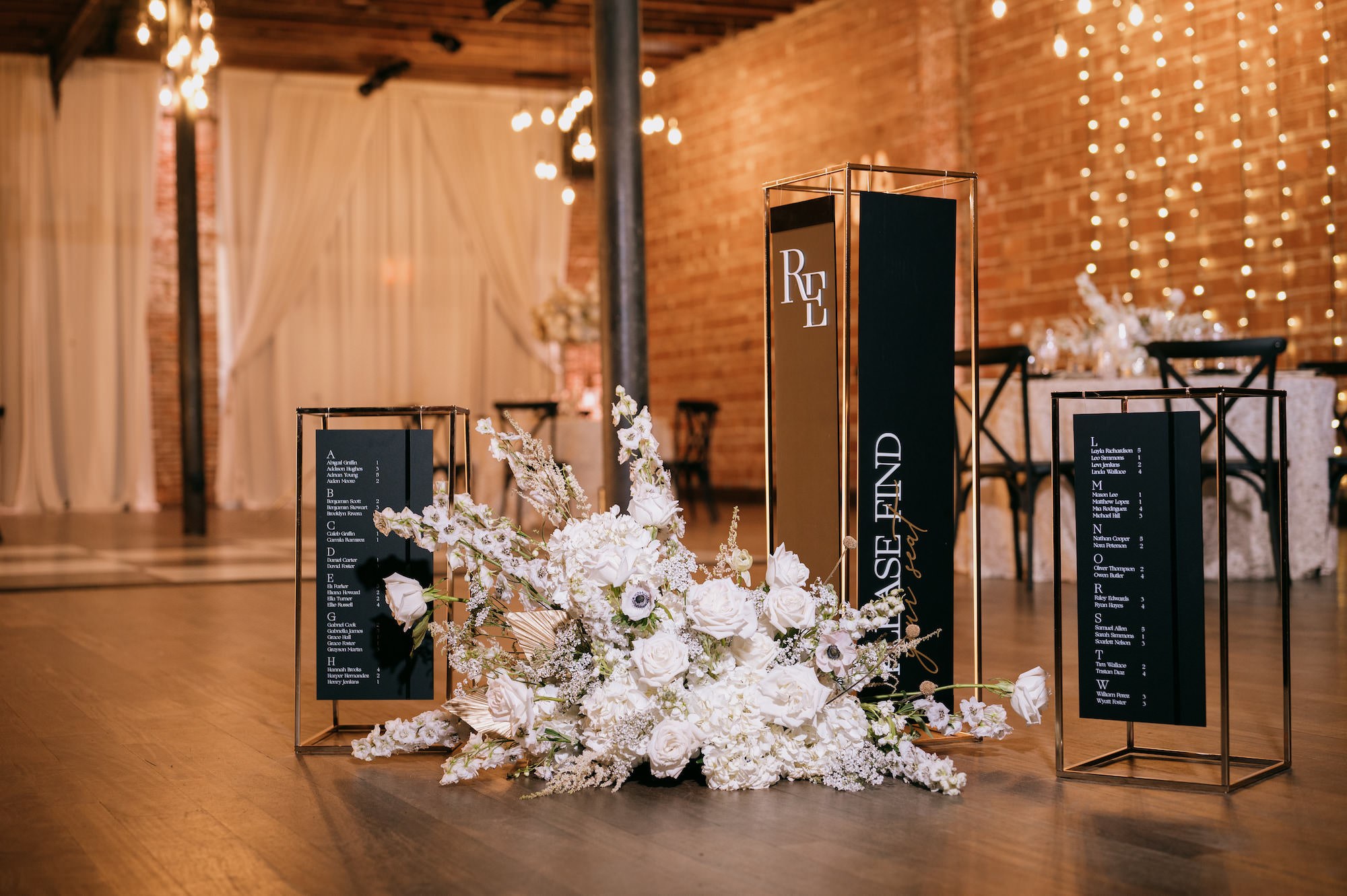âSince the theme was Modern Gatsby, we took a lot of inspiration from the over-the-top grand feel of a Gatsby party and combined it with the current trend of bloom-heavy yet whimsical florals. We didn’t include a single stem of greenery in this whole shoot,â Floral Consultant and Designer Shelby Moody with Marigold Flower Co. shared. âKelci, the amazing planner, wanted to do a fresh take on Gatsby with this black, white, and gold theme. We wanted our flowers to have the lush feel of a Gatsby theme while still being very approachable for a couple. We included Astilbe as a subtle nod to the feather accents of 1920s flappers and gold billy balls for a subtle pop!â