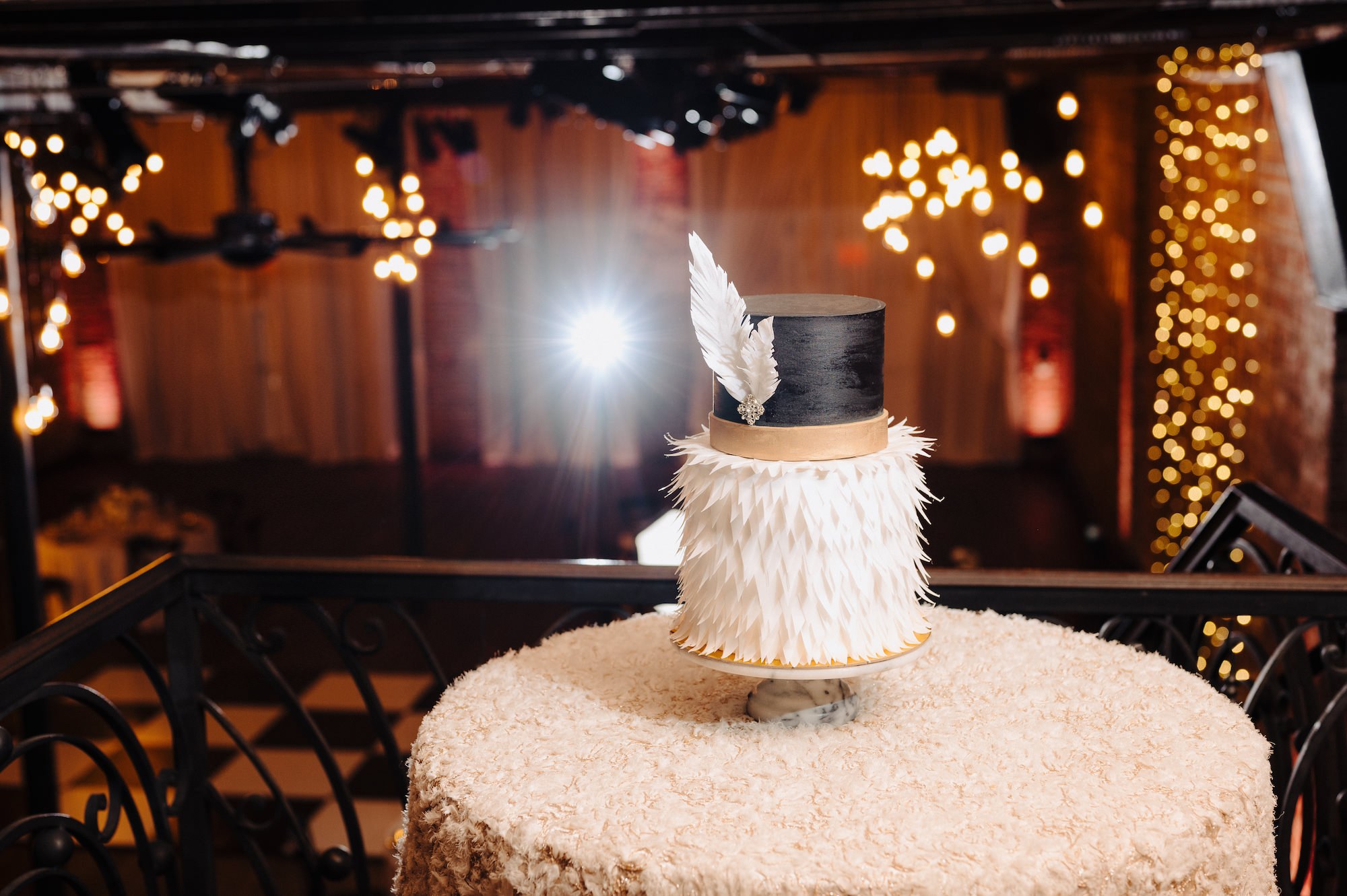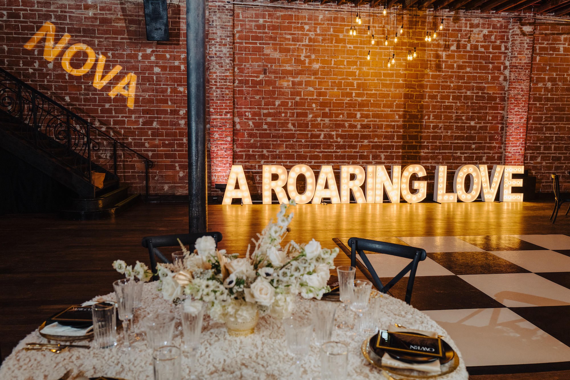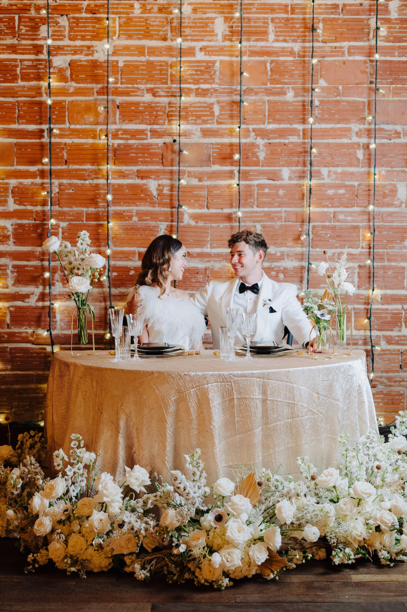 Inside the two-story loft-style venue, specialty linens and decor transformed the space from a blank canvas to a flapper’s dream speakeasy. The tall floral centerpieces seamlessly complemented the stunning design of the sweetheart table, standing out against the captivating stringlight wall, while the venue’s chic bar showcased their extended variety of local brews.
