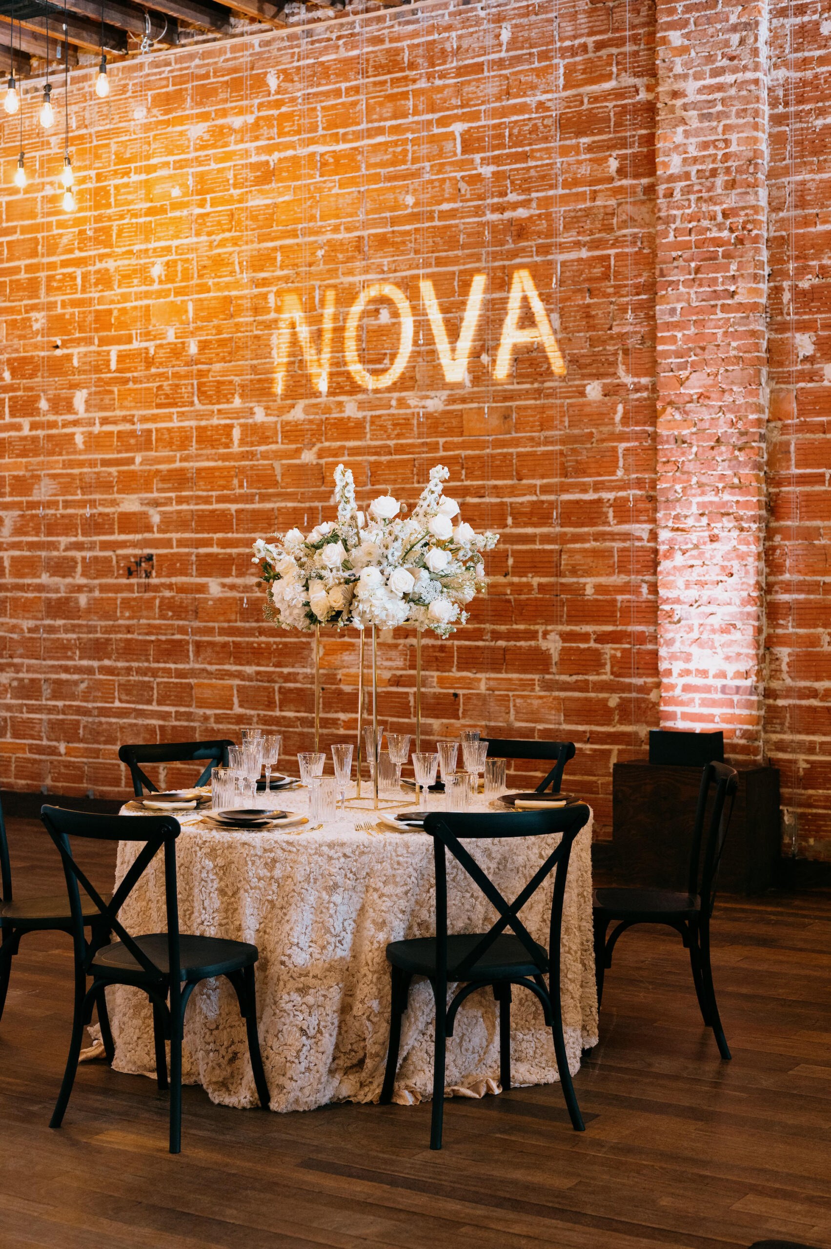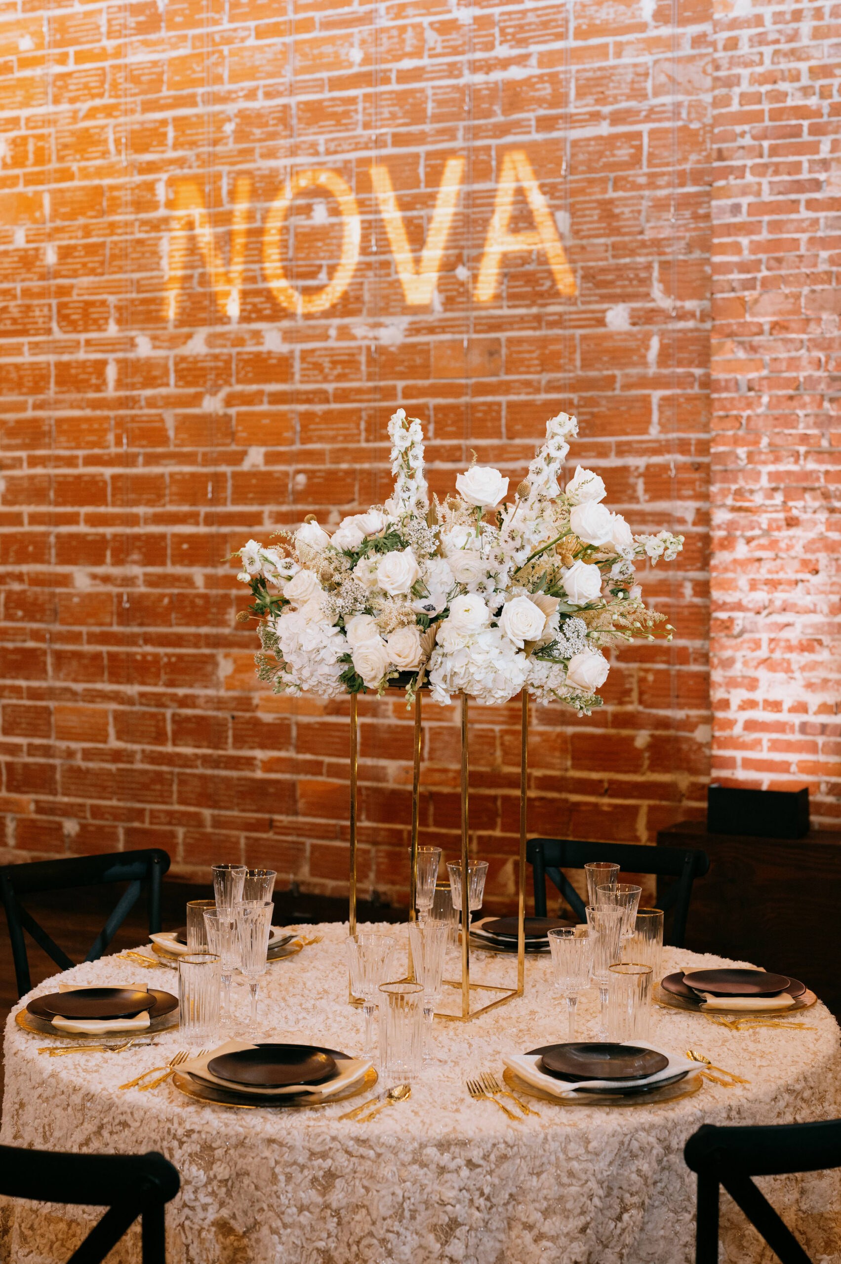 âThe theme was Modern Gatsby. The aesthetics of NOVA 535 drove the theme of this shoot. NOVA 535 was the perfect wedding venue to incorporate a big theme and gave it that modern flare, with the dim lighting, exposed brick, and their updated color palette of the ceremony space,â wedding planner Kelci Zicconi of Kelci Leigh Events explained. âOur colors were black, white, and gold. We had some shimmery touches with layering linens and stationery.â