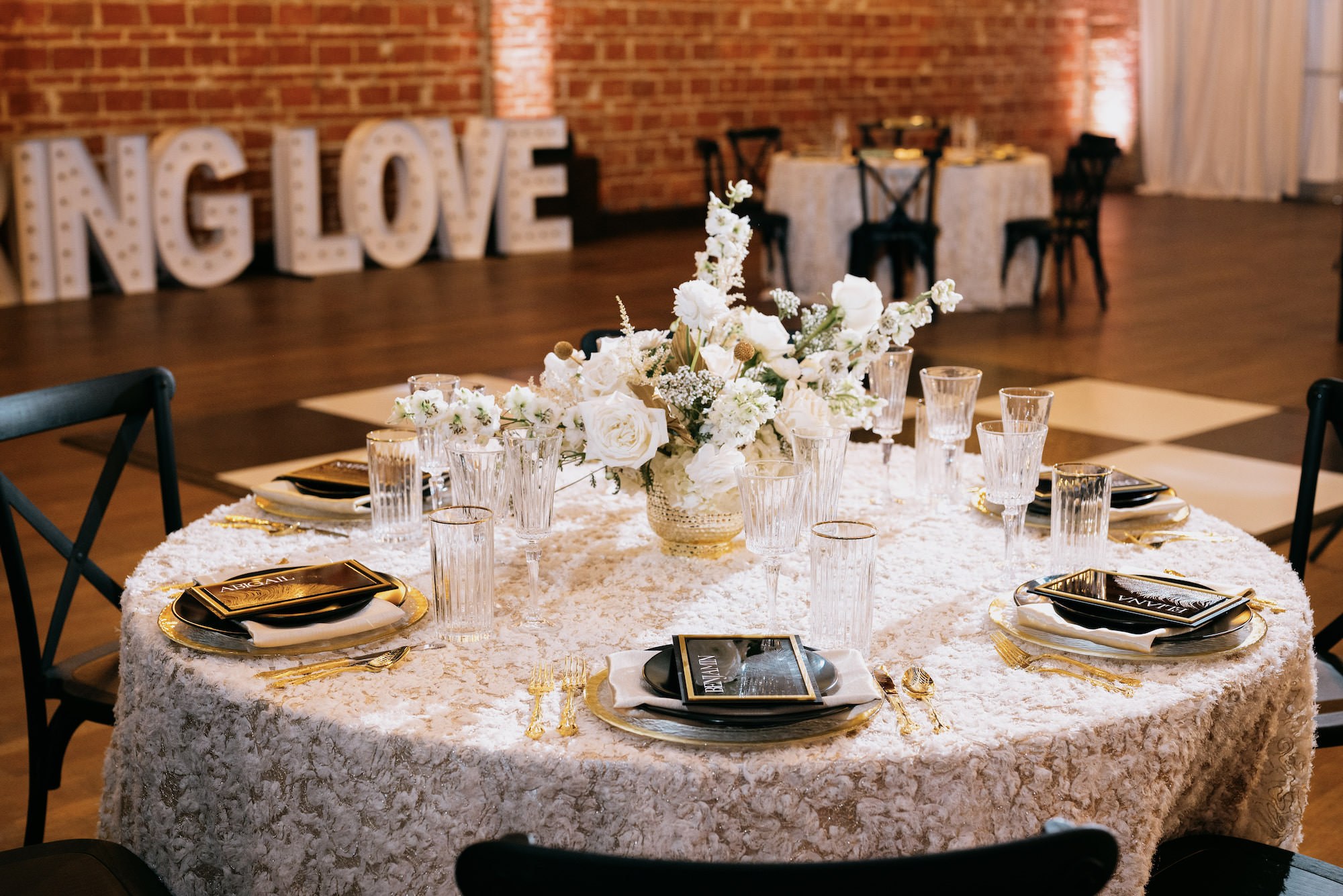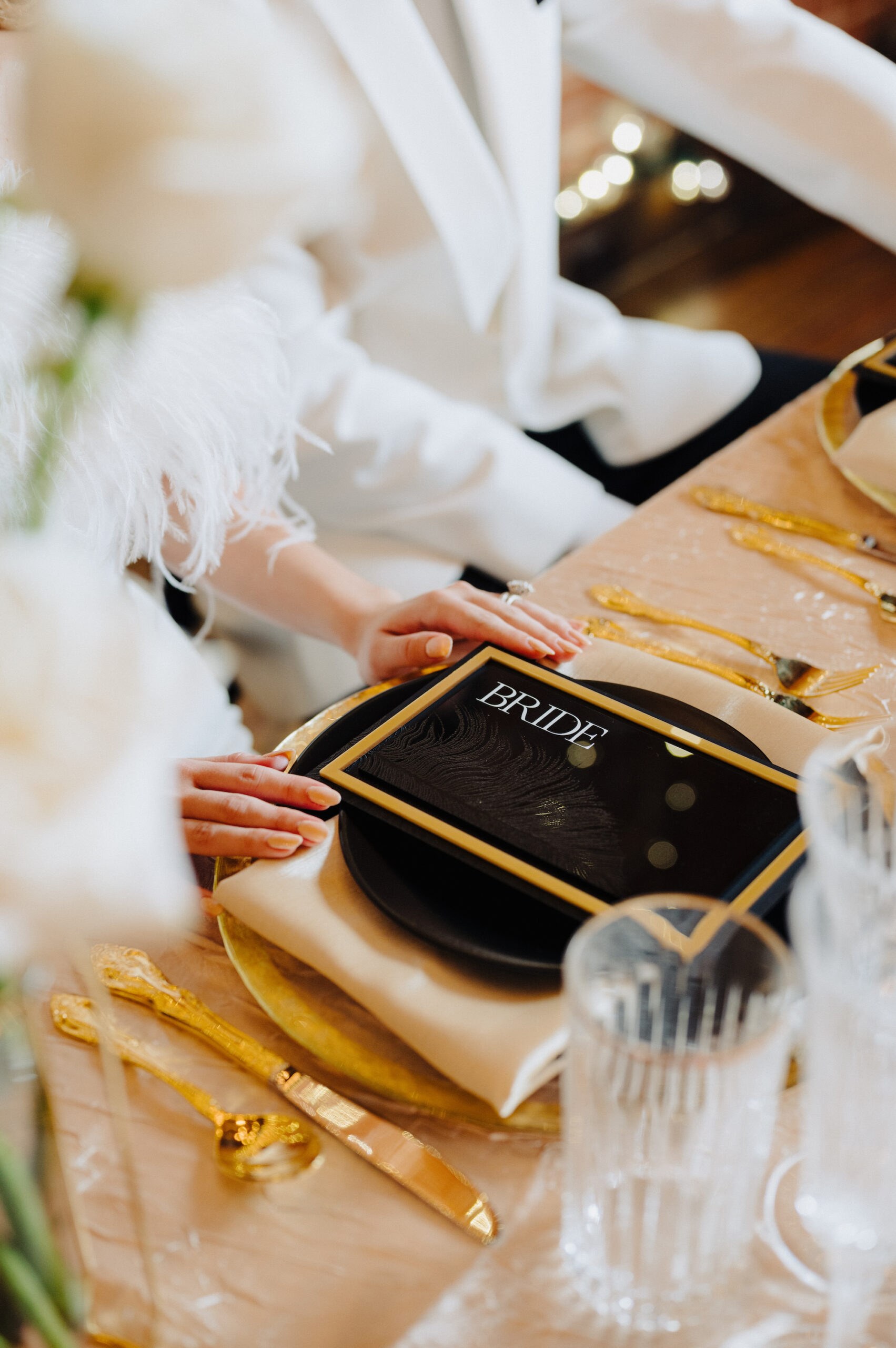 âFlorals and feathers were the focal points,â the wedding planner detailed. âTextured linens are so fun and really can make a huge difference if you want to go minimal on tabletop decor.â