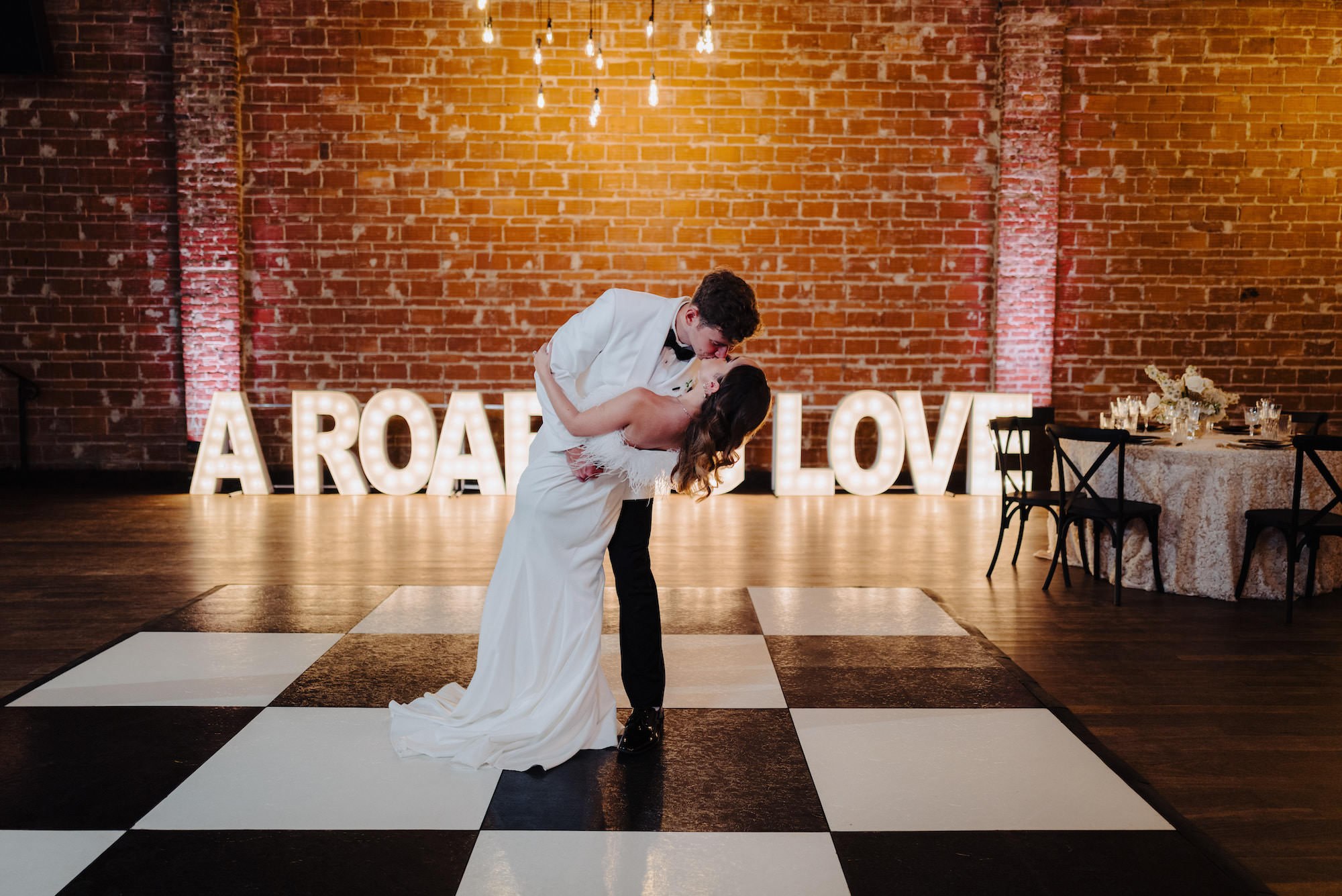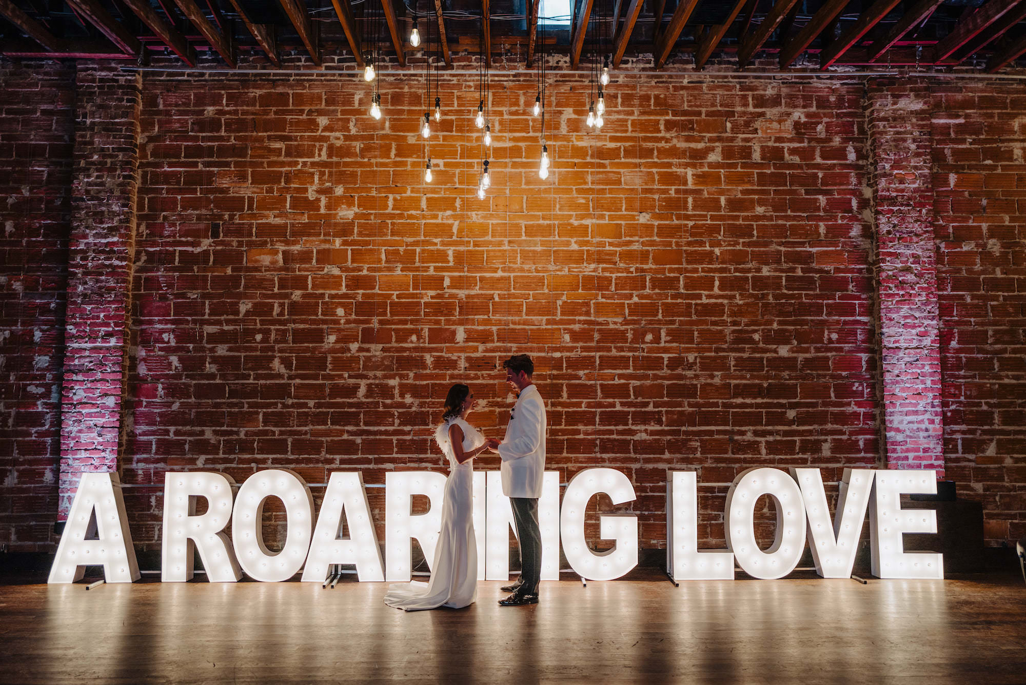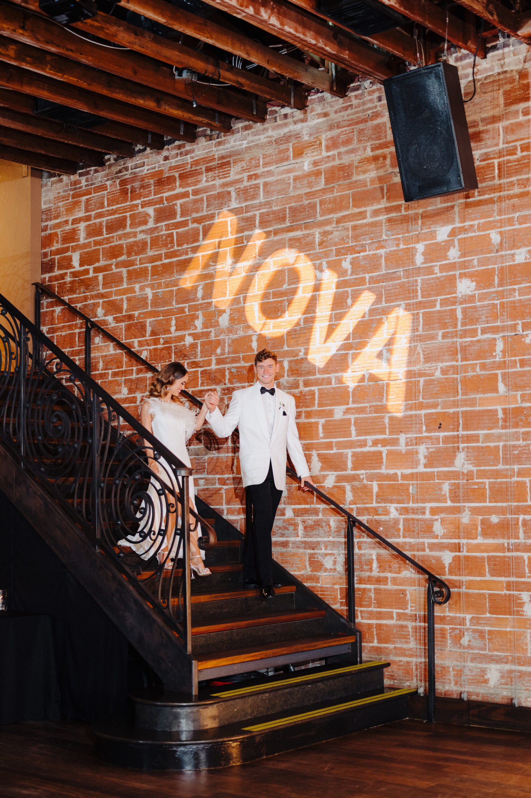As a striking focal point, light-up letters were showcased against the exposed brick wall, creating the perfect backdrop for unforgettable portraits. With its spacious courtyard, the wedding planner orchestrated a grand exit for the couple, who made a stylish getaway in a vintage car.