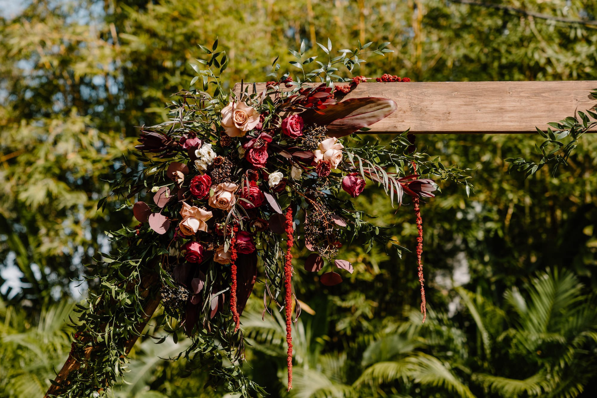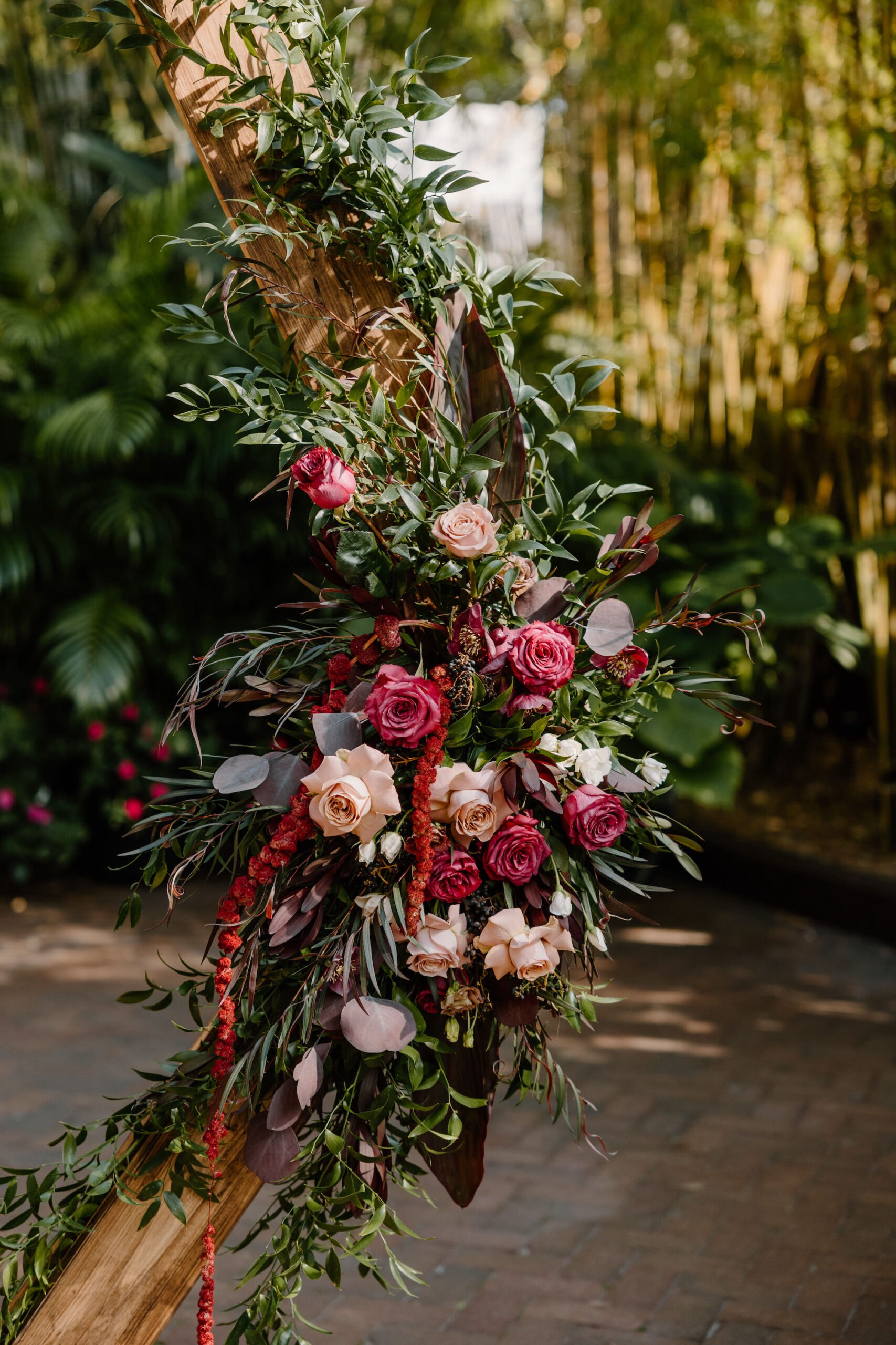 The moody wedding aesthetic seamlessly translated into the bride and groom’s attire, with floral styling providing an artistic contrast. The bamboo courtyard ceremony against NOVA’s wooden arch, adorned with romantic cascading florals, became a visual statement.
