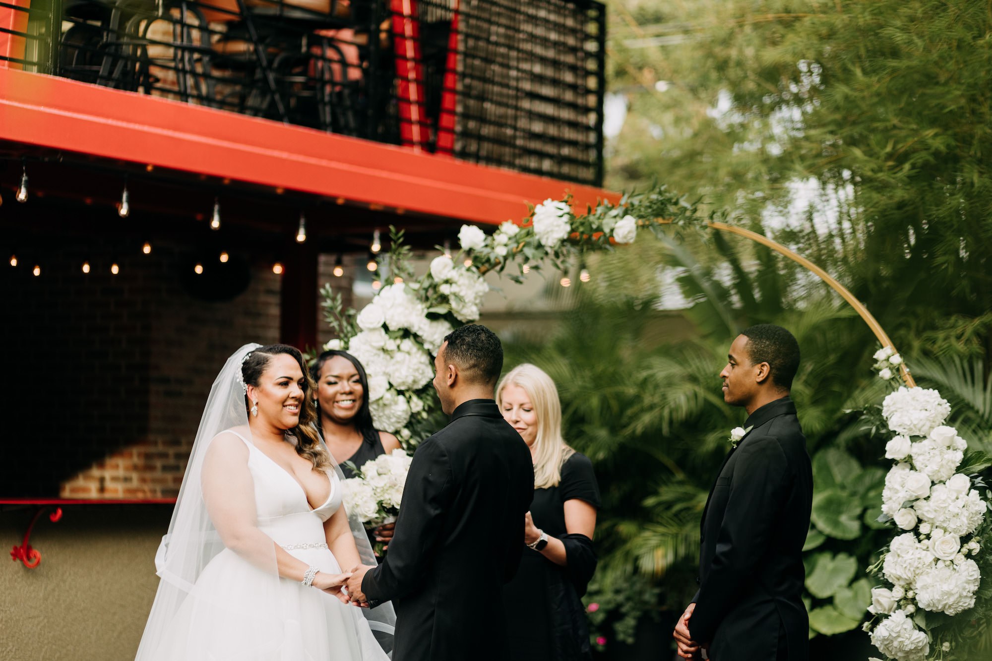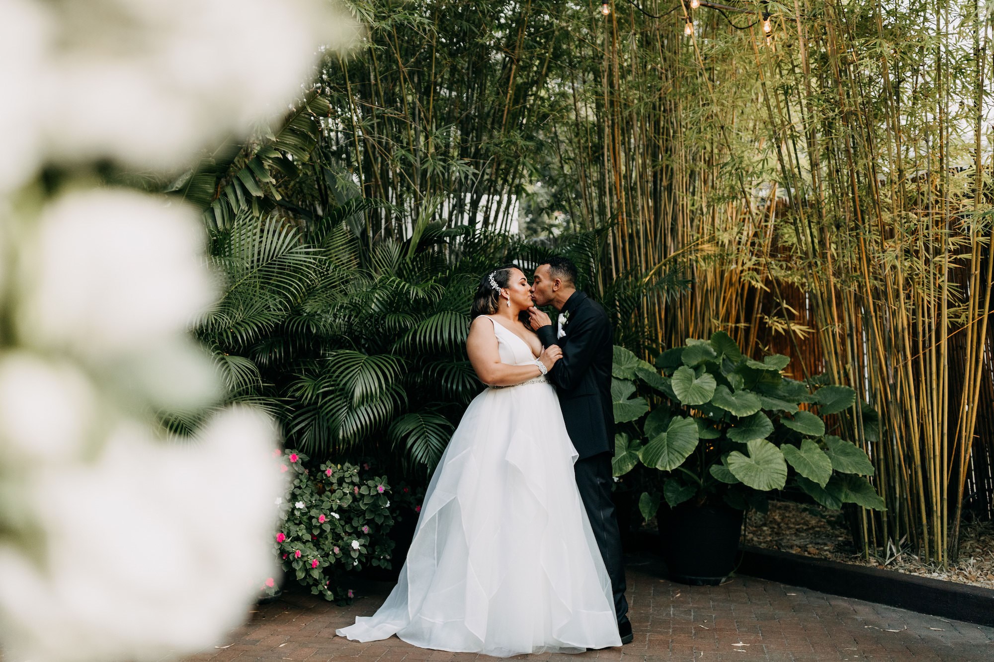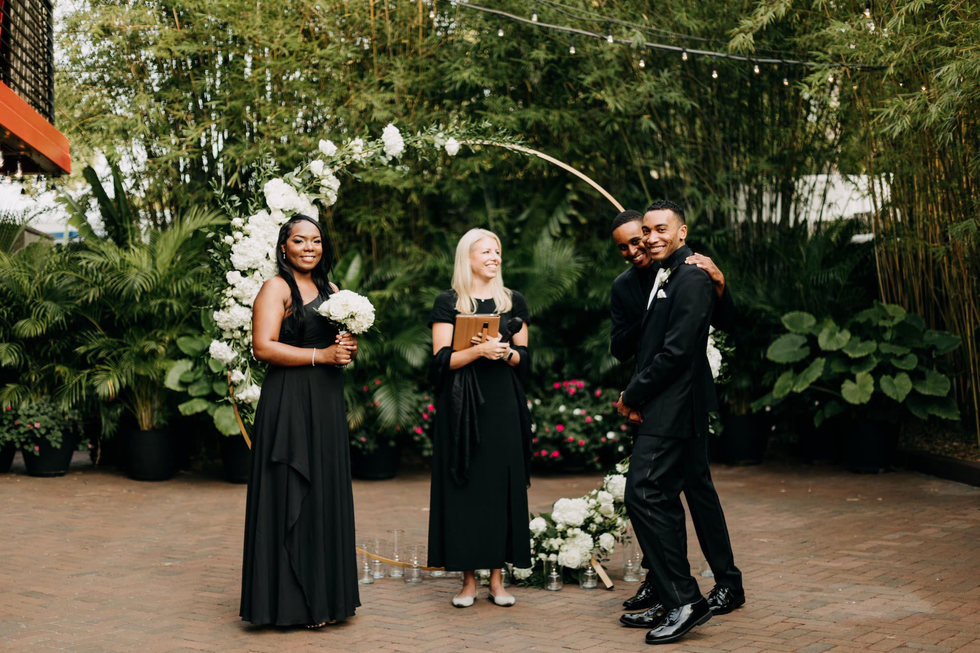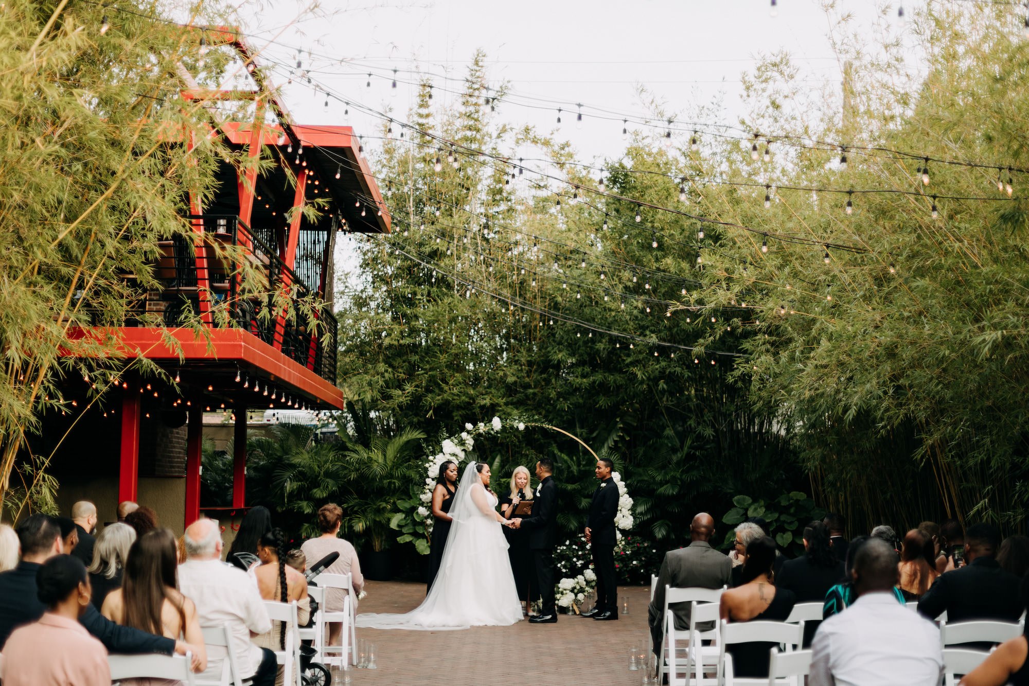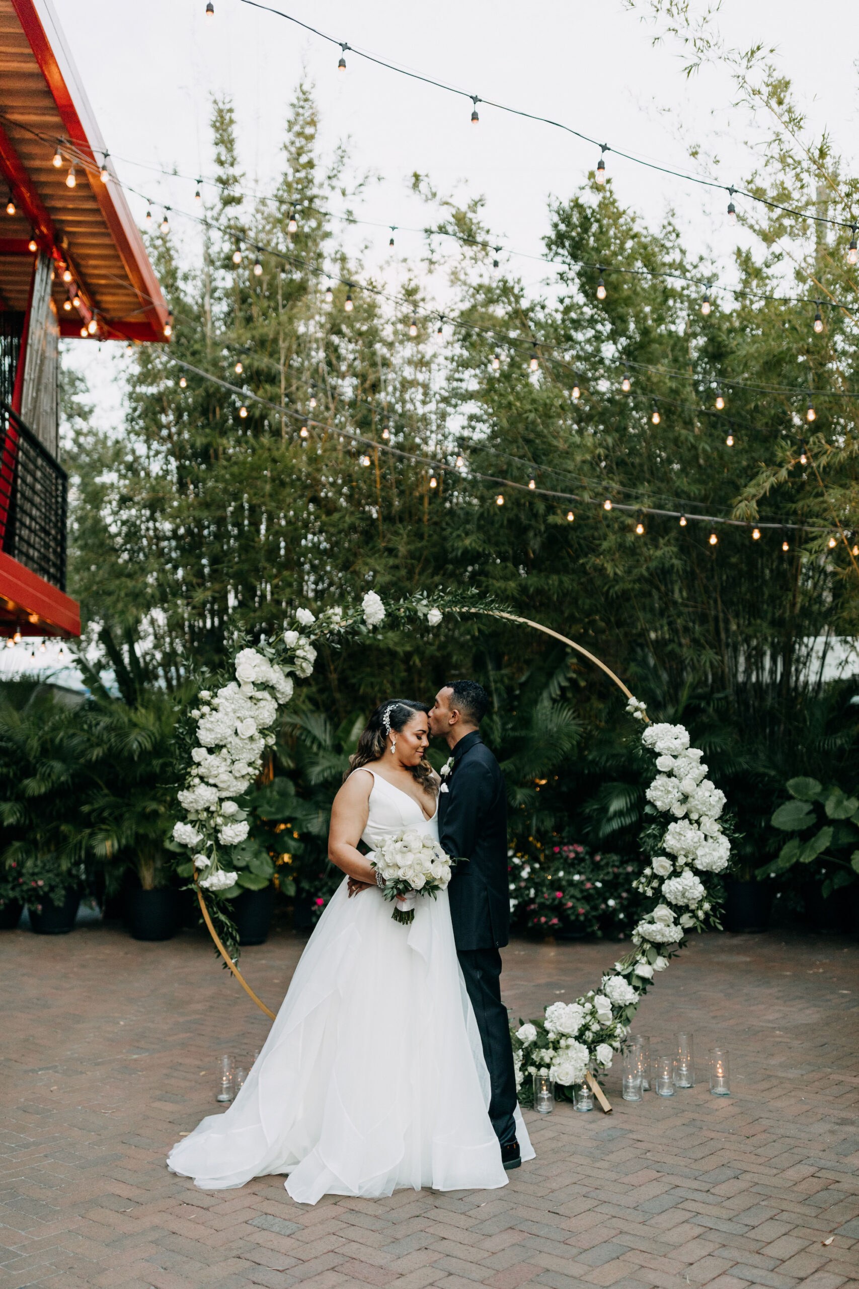 Shelby and Keoni’s winter Florida wedding unfolded as a timeless black and white affair, showcasing chic and modern decor against the picturesque backdrop of NOVA 535’s bamboo courtyard and 1920s exposed brick interior.