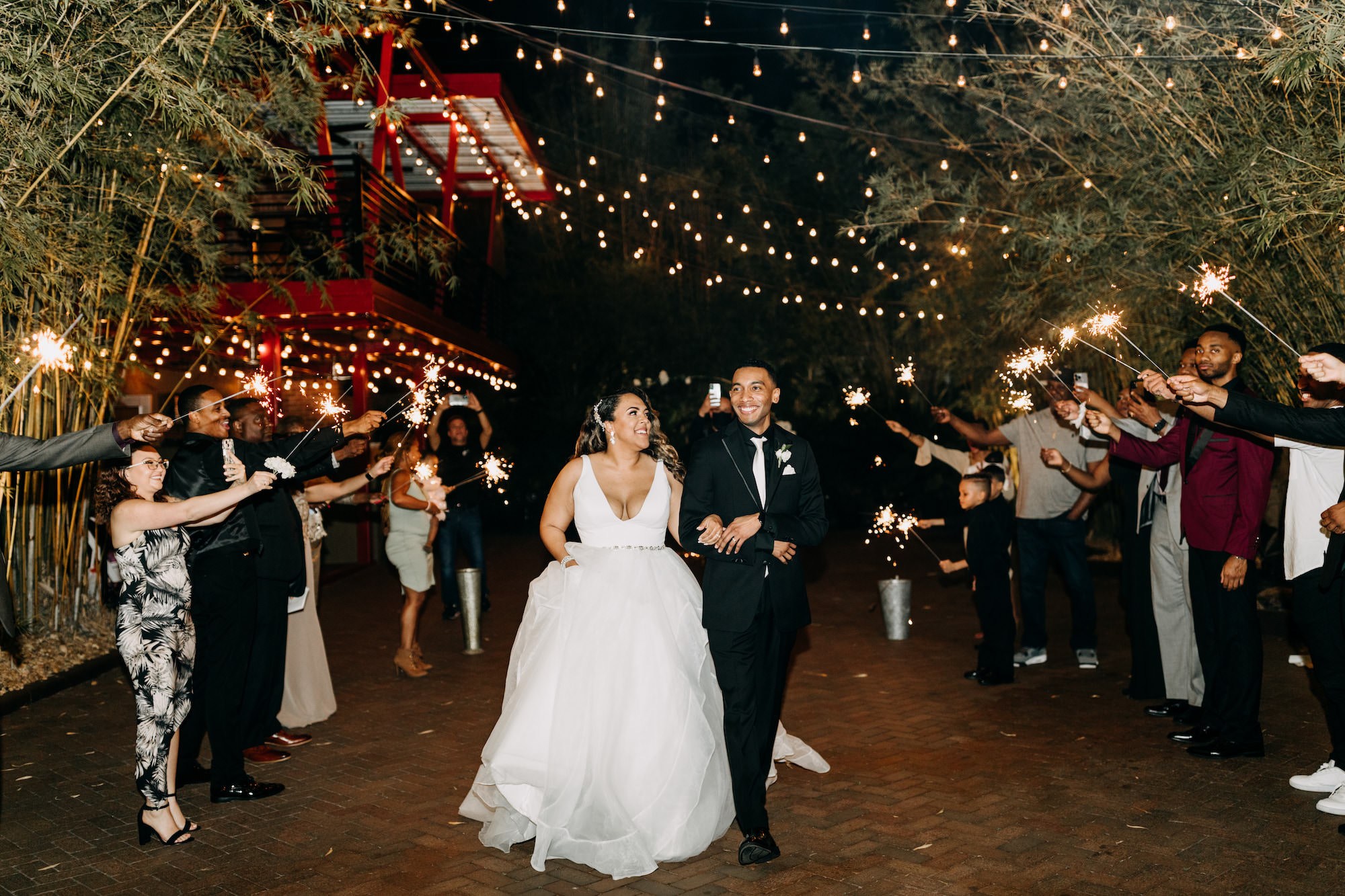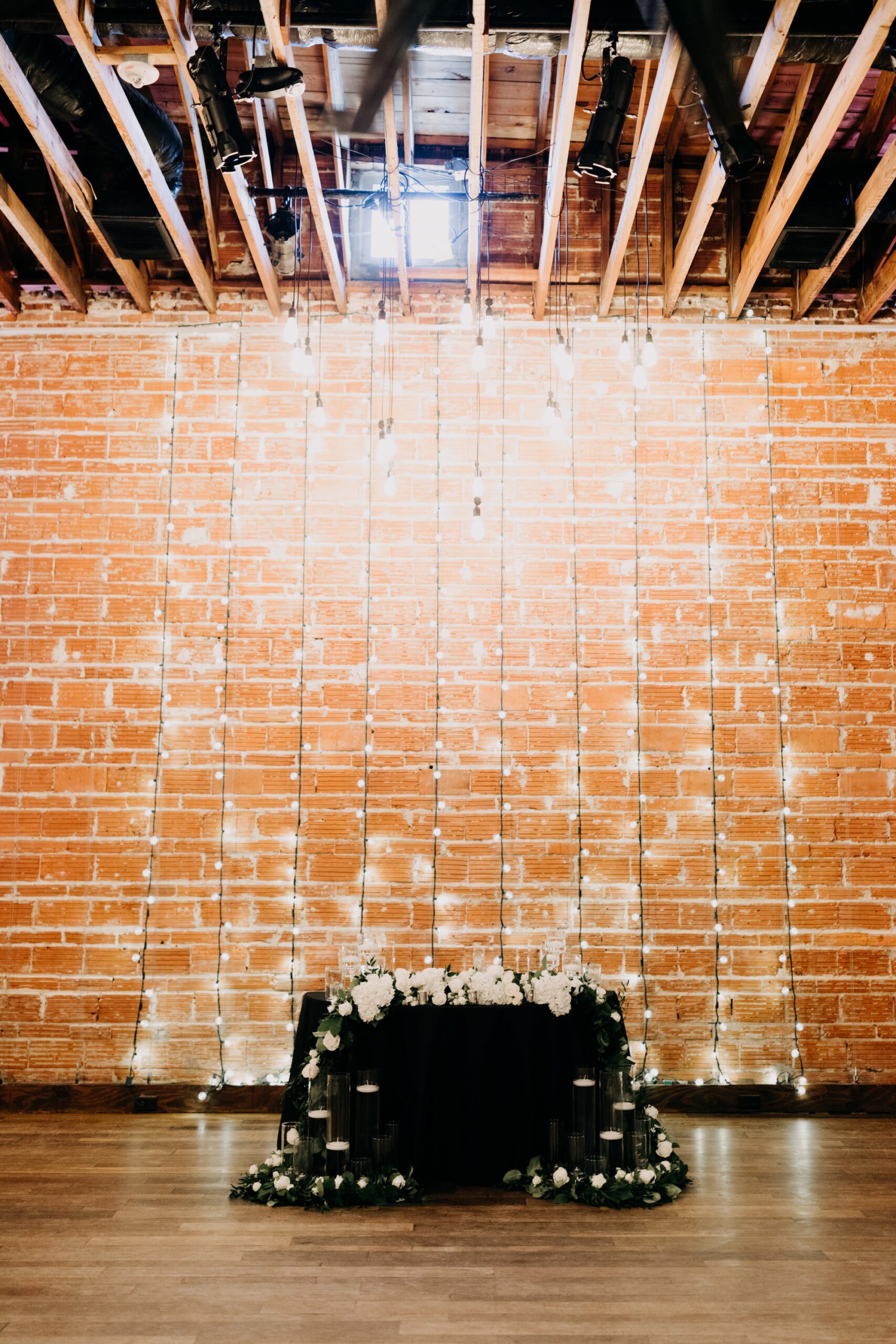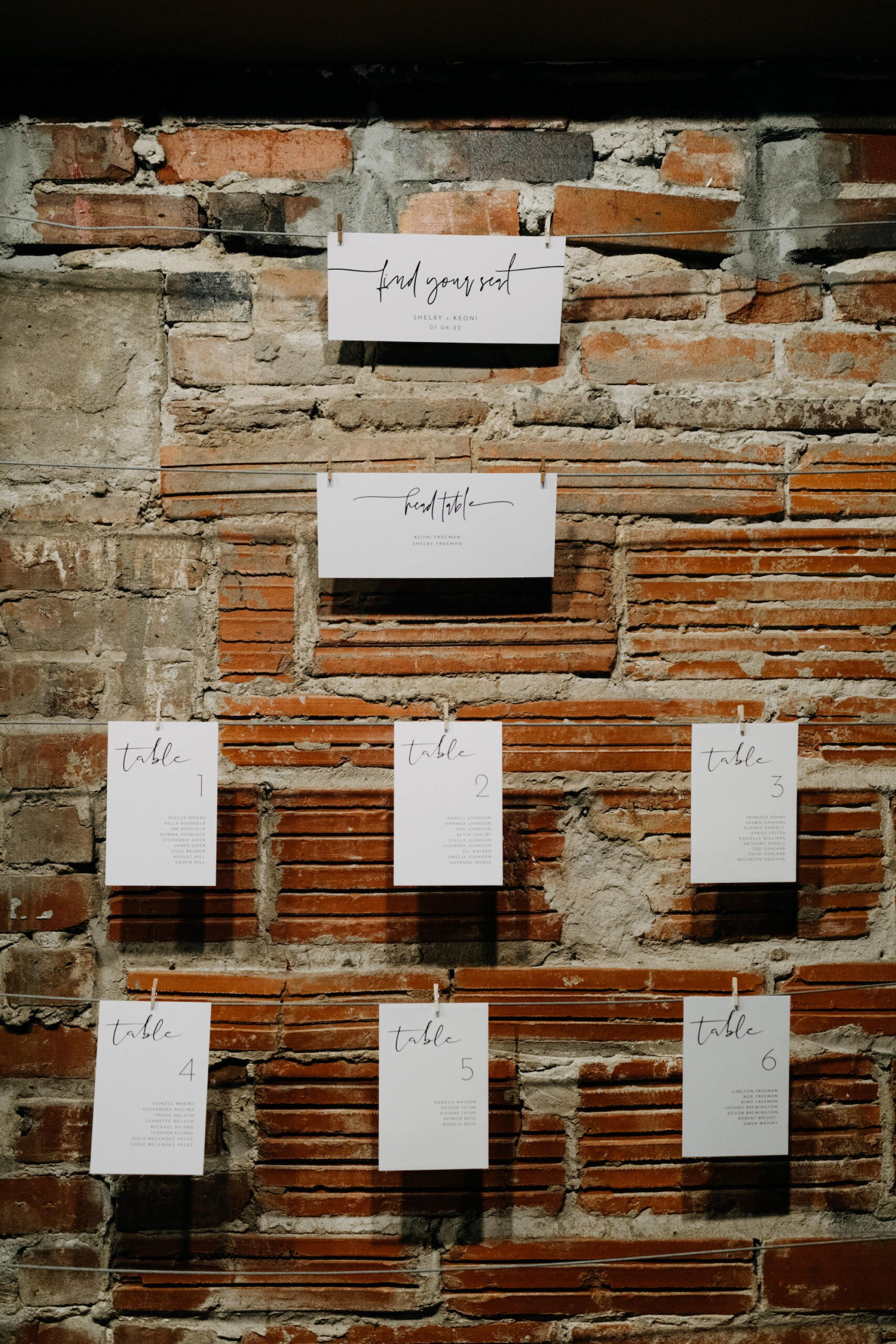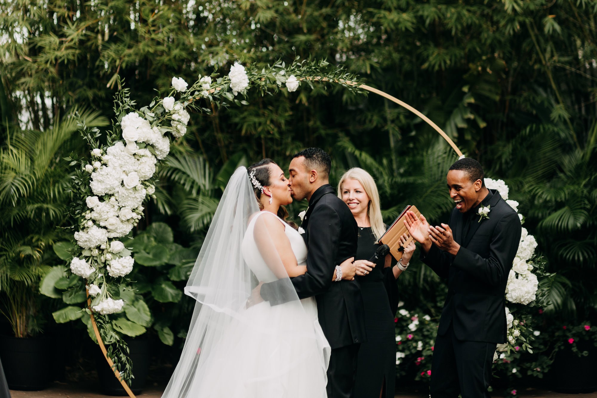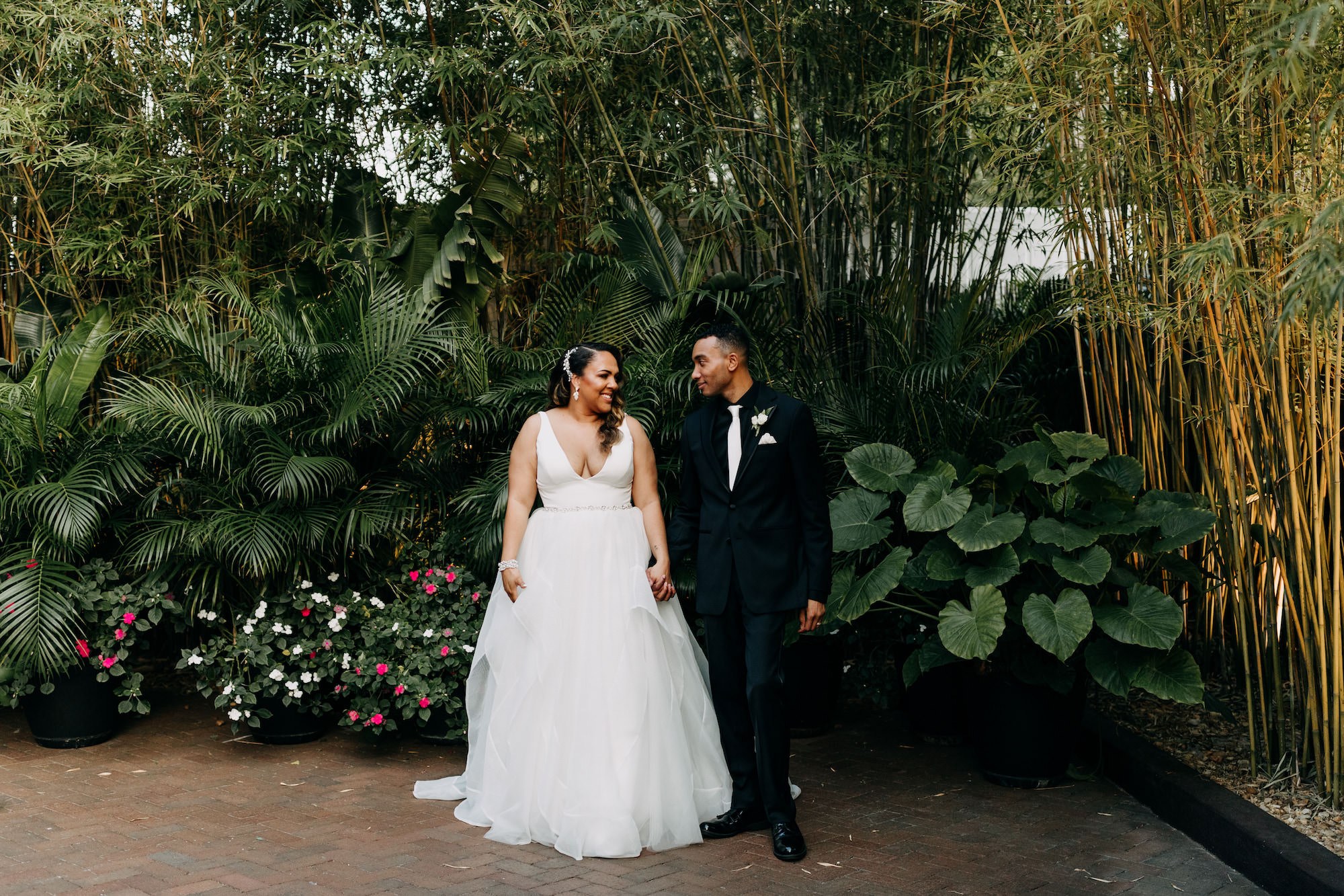 Shelby and Keoni’s winter Florida wedding unfolded as a timeless black and white affair, showcasing chic and modern decor against the picturesque backdrop of NOVA 535’s bamboo courtyard and 1920s exposed brick interior.