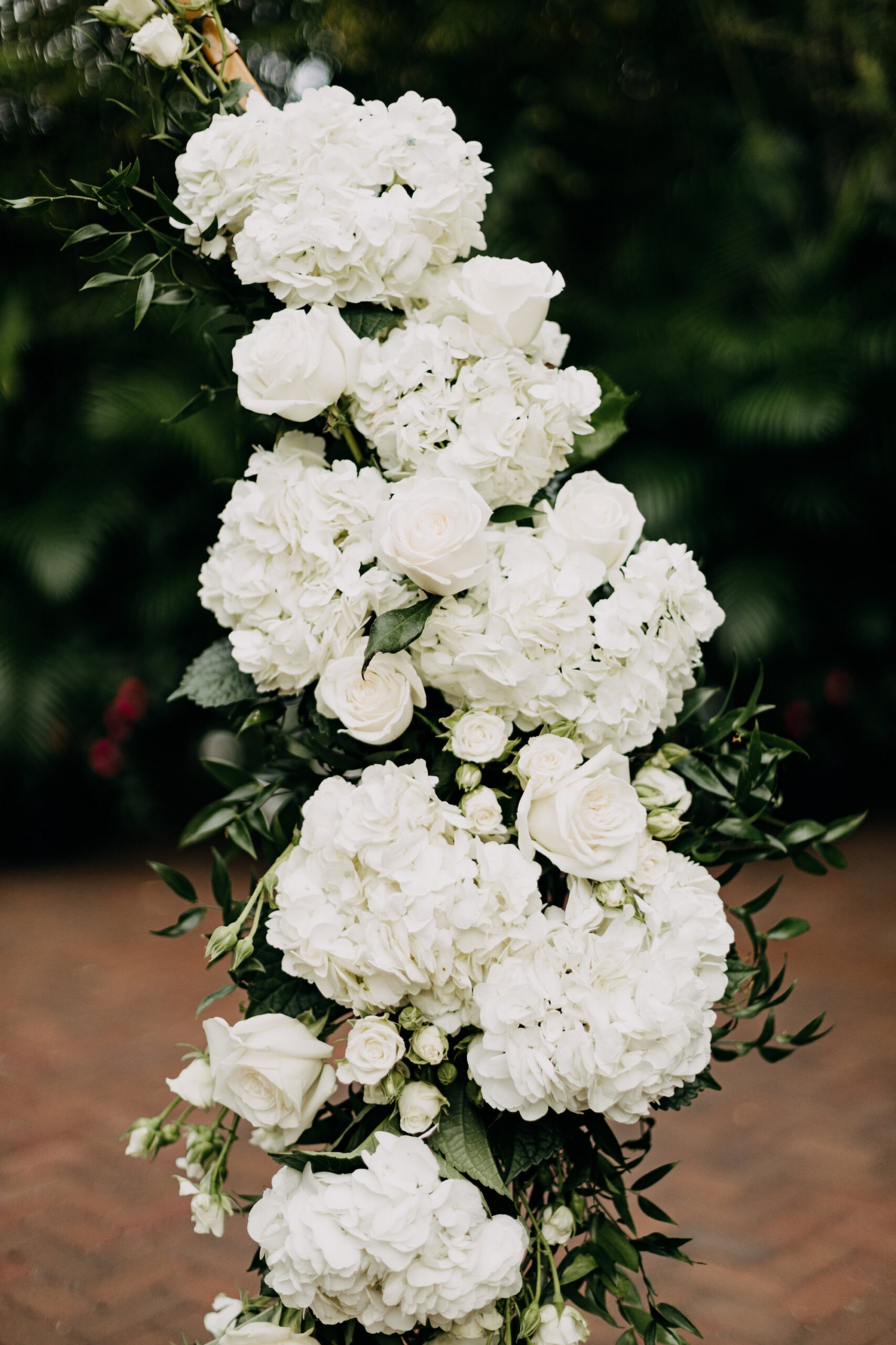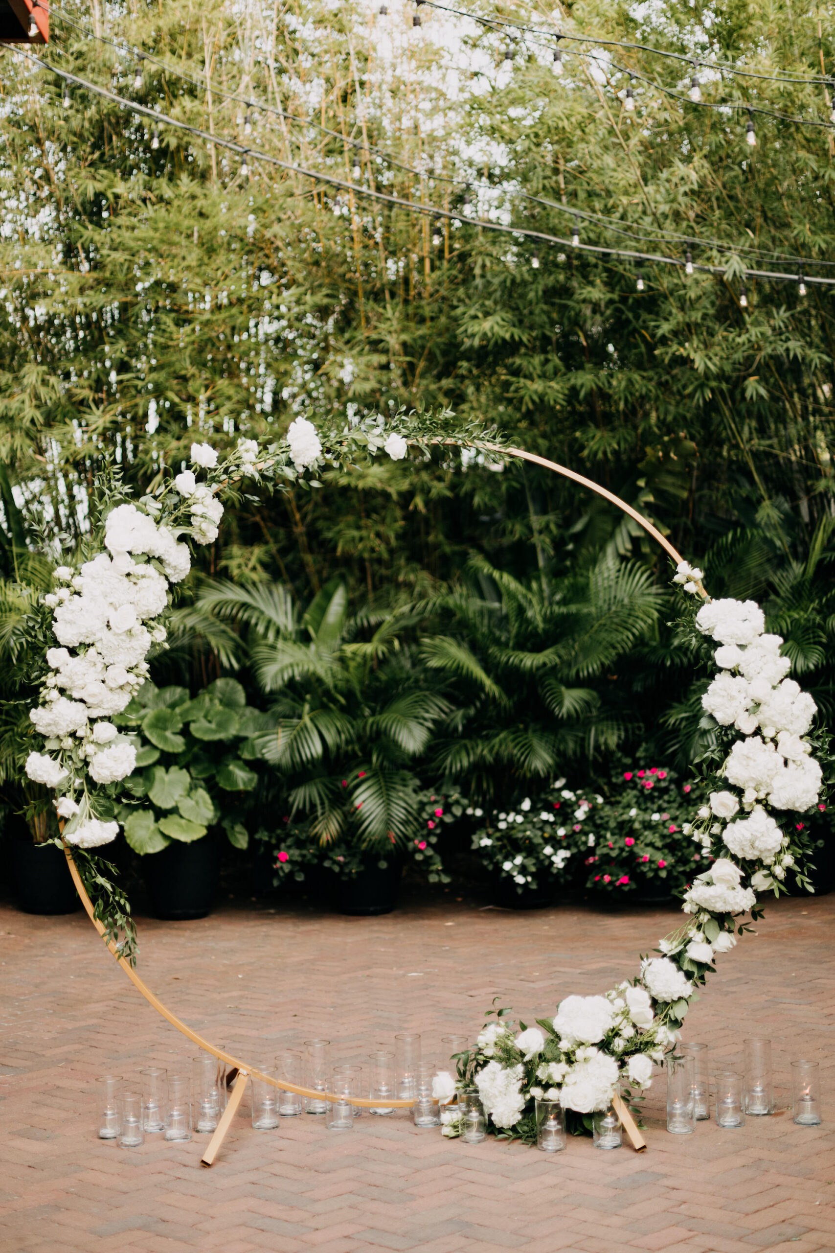 Highlighting the inherent beauty of the venue, Shelby decorated the outdoor ceremony space with white chairs and a breathtaking circle arch adorned with lush white florals, creating a striking contrast against the rich greenery of the secluded courtyard.