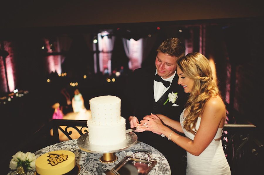 Our elegant and vintage theme was based off Gatsby-esque style: metallics, sparkles and lace. Mike liked more elegant wedding styles and rich colors; he chose the colors for the wedding: gold, black and ivory. It was the first thing we did after becoming engaged! His alma mater is the University of Central Florida and the colors worked well for what we had in mind for a decor theme.